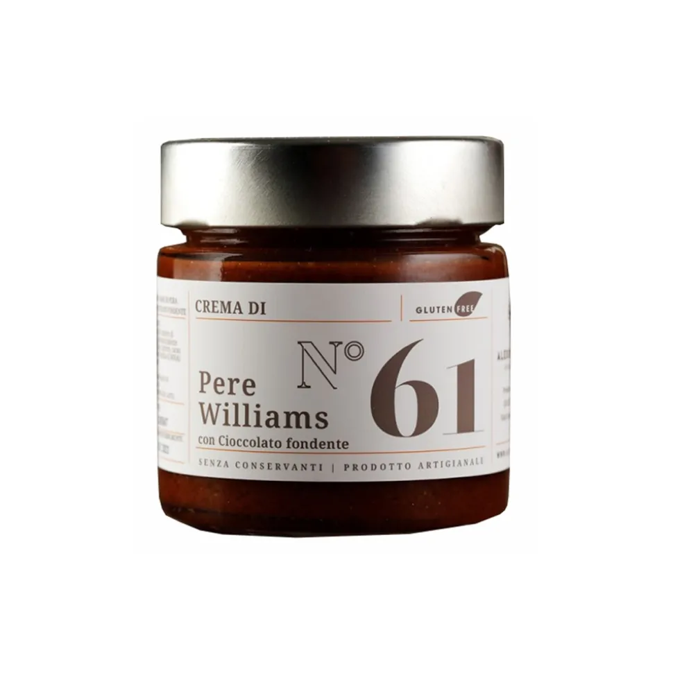 Williams pear, caster sugar, dark chocolate 60 % min (cocoa paste, sugar, cocoa butter, Emulsifier:soy lecithin, Flavoring), and lemon juice. May contain traces of nuts, lactose and milk protein.