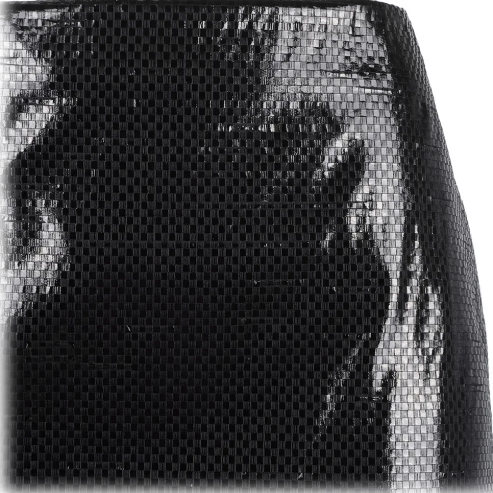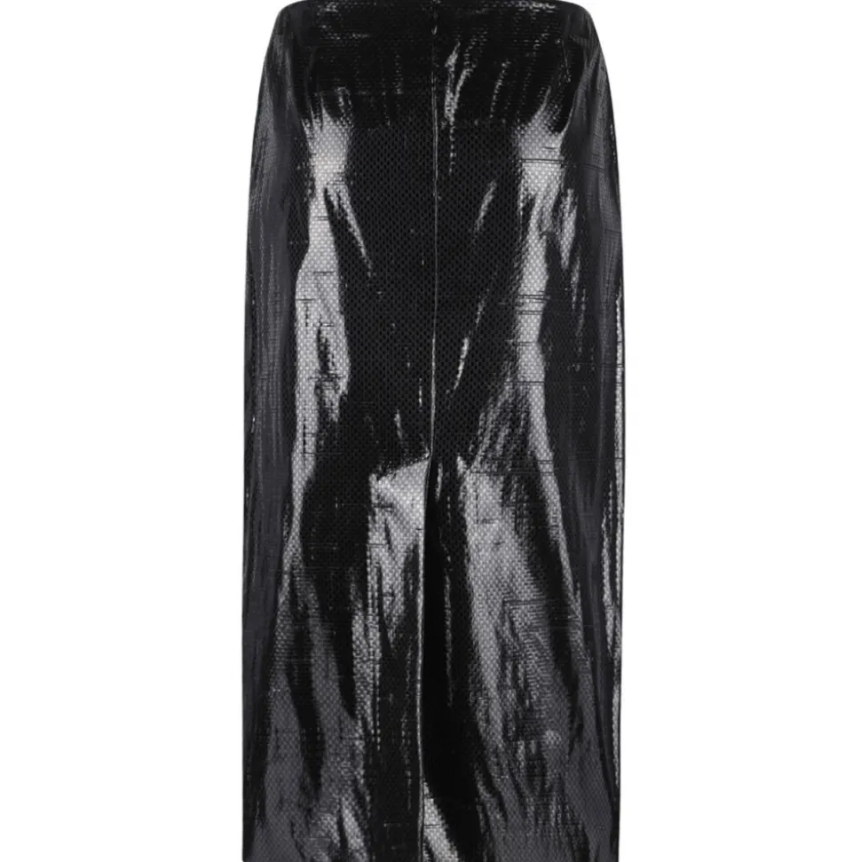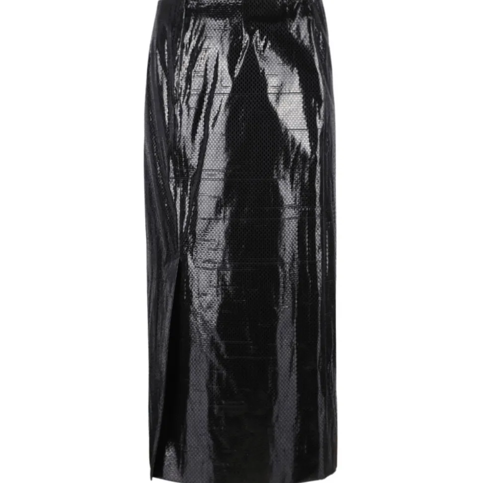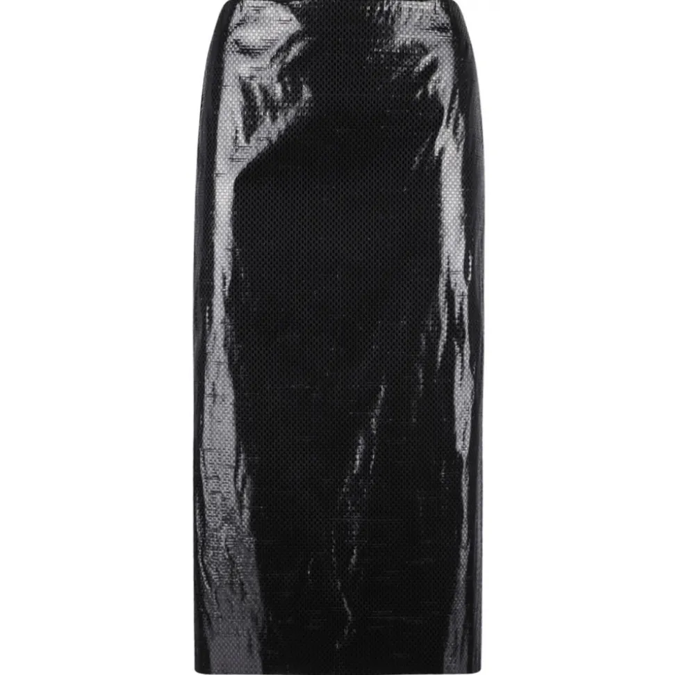 Alexander Mcquenn Black Pencil Midi Skirt. Black silk blend midi skirt, tarpaulin weave, interwoven design, glossy finish. Concealed rear hook and zip fastening, low-rise, dart detailing, rear slit. Full lining, straight hem, mid-length.