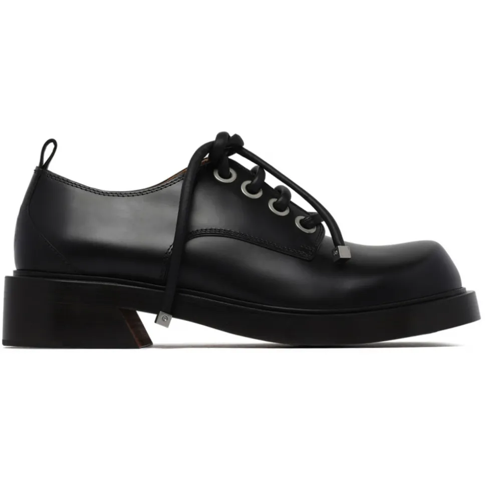 Alexander McQueen Shiny Black Calfskin Lace-up Shoes, oversized square toe and tubular laces with silver square ends and skull detail. Embossed inverted skull on the back.