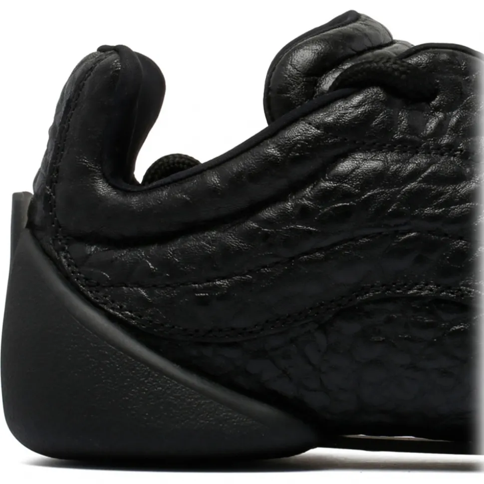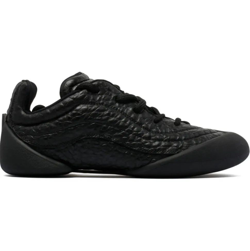 Alexander McQueen Men’s Flexion Black Sneakers with slim profile, ergonomic design with an anatomical feel. Soft black leather is contrasted with bold tubular shoelaces.