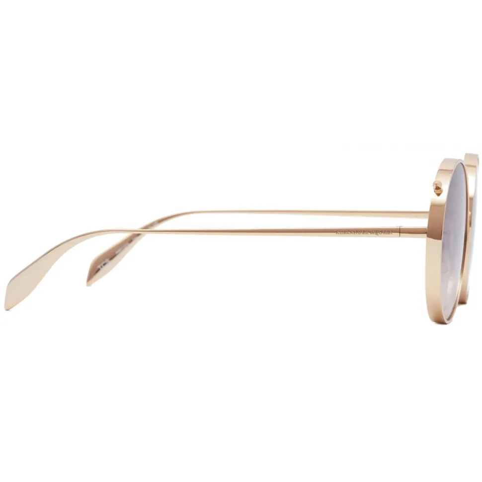 Round metallic frame sunglasses featuring a piercing bar running through the front and mini stud detailing on each end. The sunglasses have fine metallic temples, which are finished with the Alexander McQueen signature engraved tone on tone.