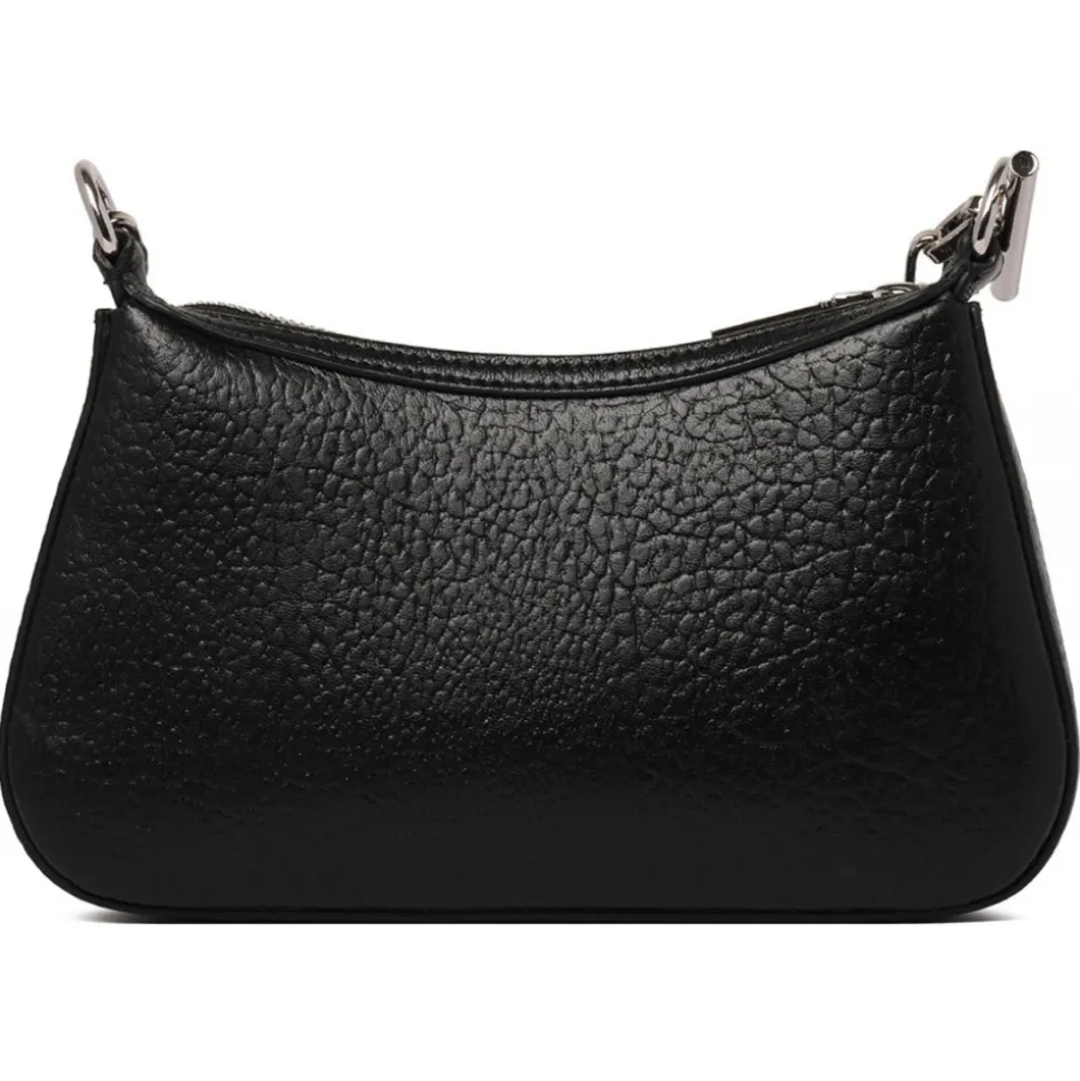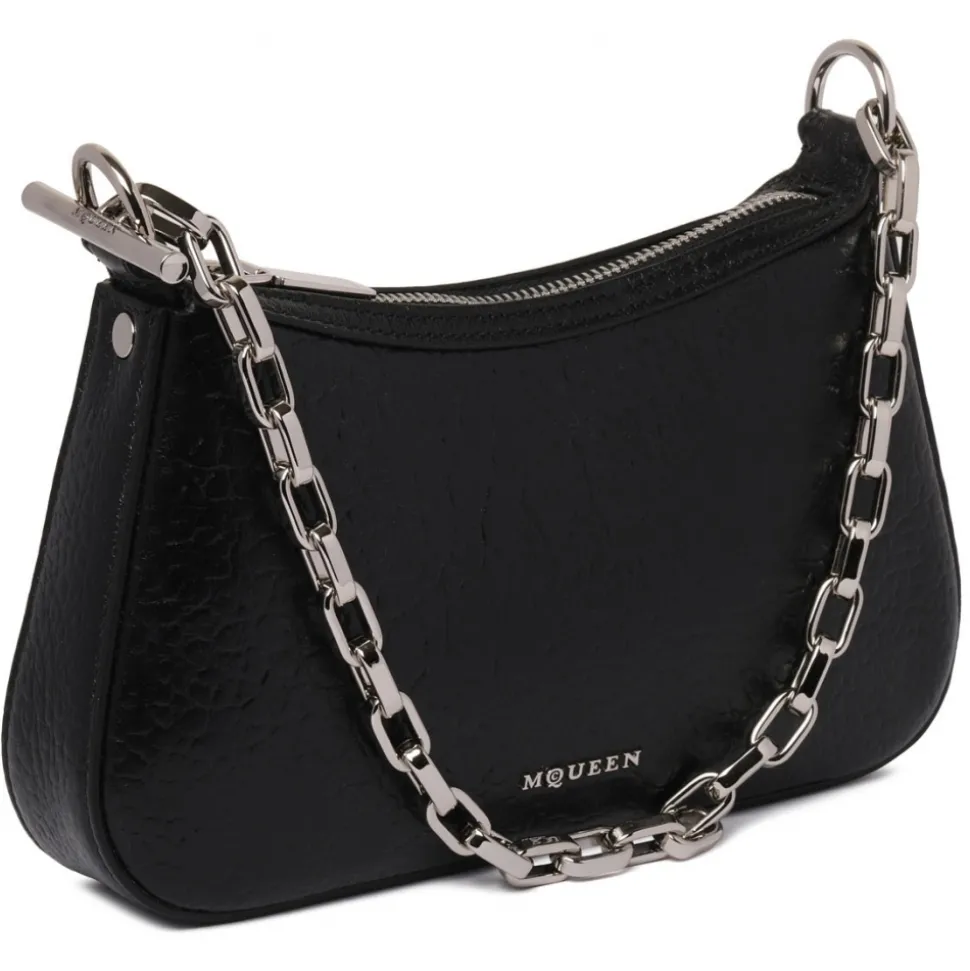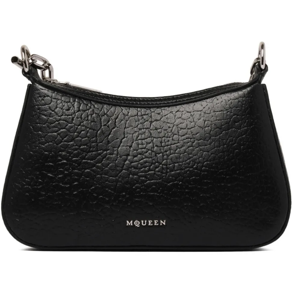 Alexander Mcqueen Black Mini Clutch Bag. Black t-bar mini clutch, elegant curved silhouette in black full grain lambskin. Features a silver metal chain shoulder strap with signature T-bar hook end and engraved McQueen logo. Carry on the shoulder or fold over the arm with the chain shoulder strap.