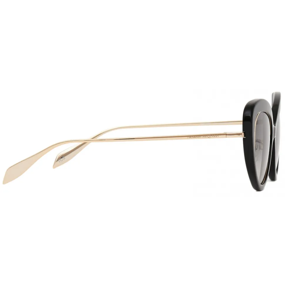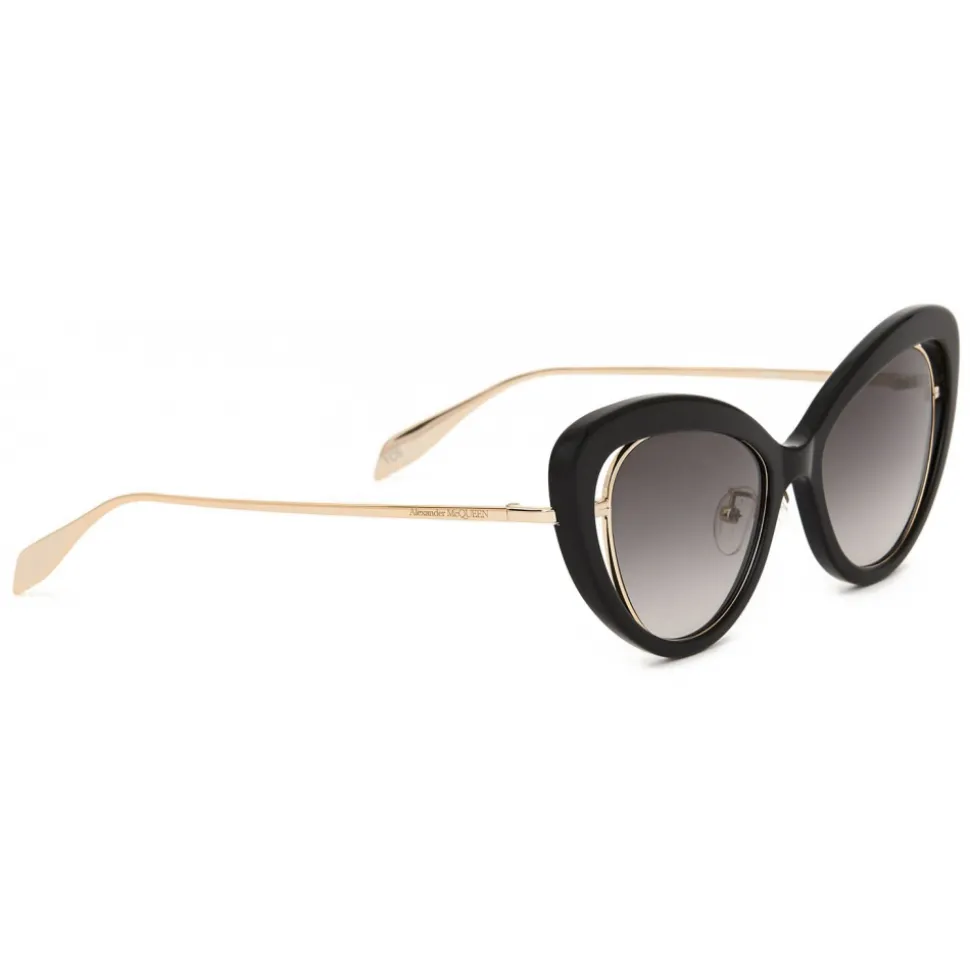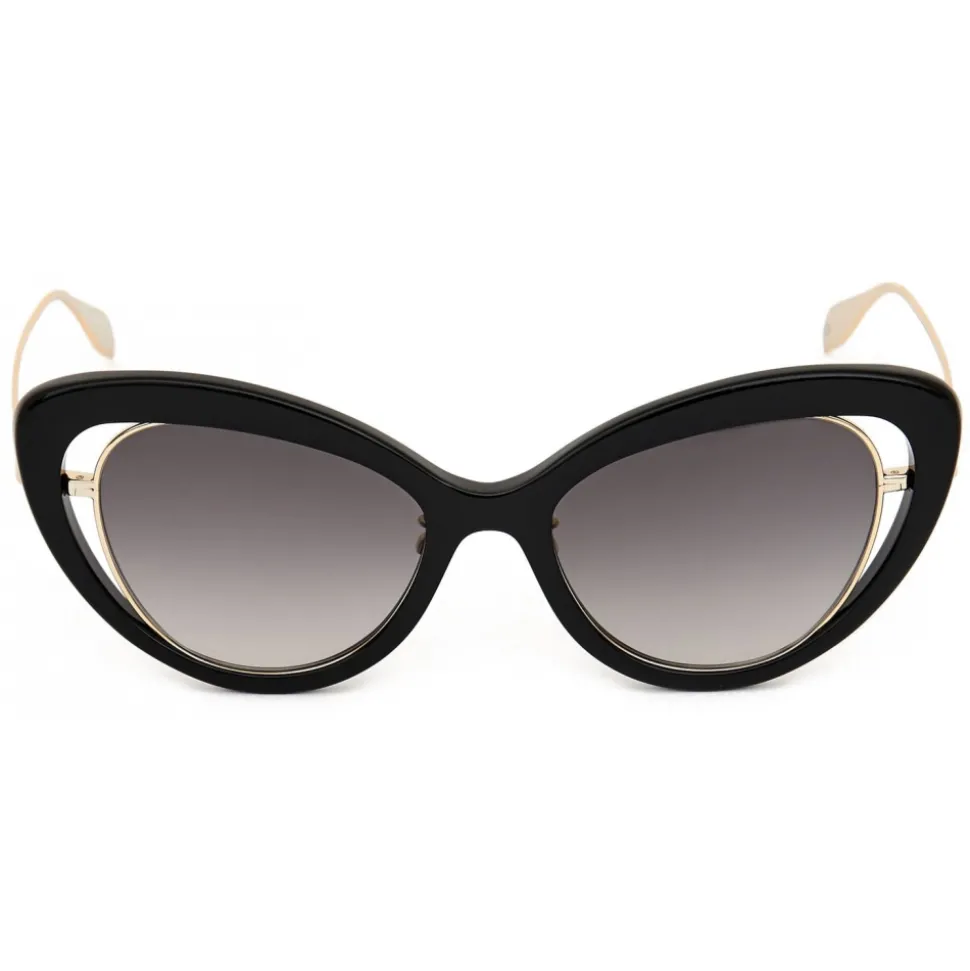 Black cat-eye metal sunglasses fitted with grey gradient lenses. Open wire construction with a thin inner gold metal frame and an outer black acetate frame. The sunglasses have fine metal temples with the Alexander McQueen logo engraved tone on tone.