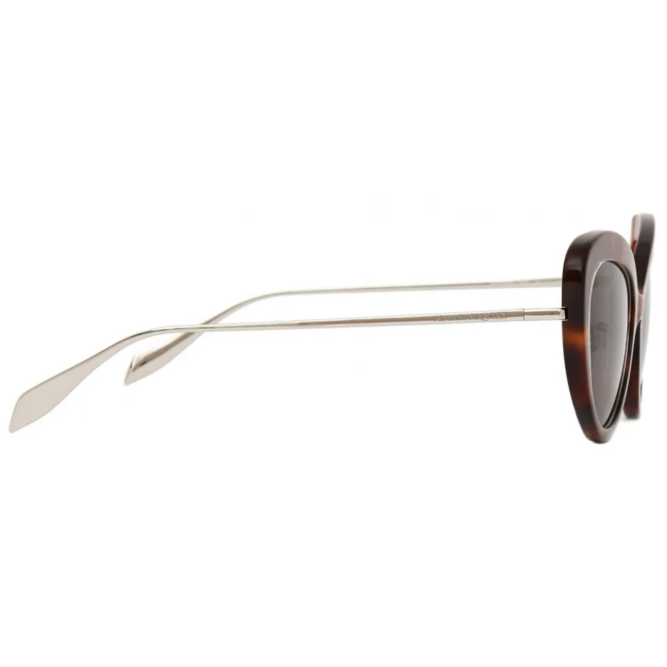Cat-eye style sunglasses are fitted with solid grey lenses. The frame is constructed of a thin inner silver sculpted metal frame with an outer havana brown acetate frame. The sunglasses have fine metallic temples with the Alexander McQueen signature engraved tone on tone.