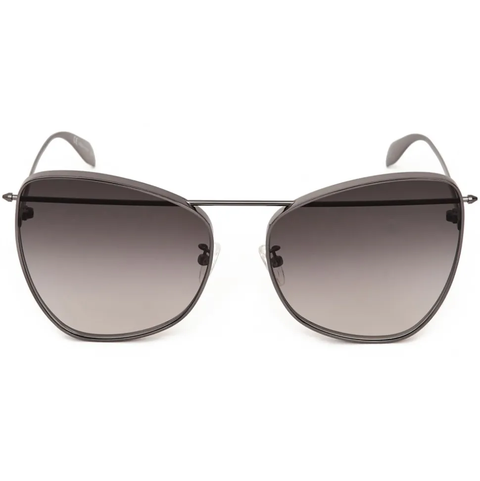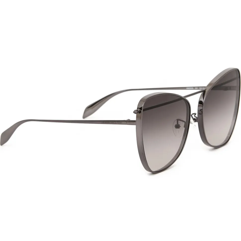 Metal cat-eye sunglasses fitted with gradient grey lenses, detailed with shiny dark ruthenium frame and a piercing bar running through the frontal. The sunglasses have fine metal temples, which are finished with the Alexander McQueen logo engraved tone on tone.