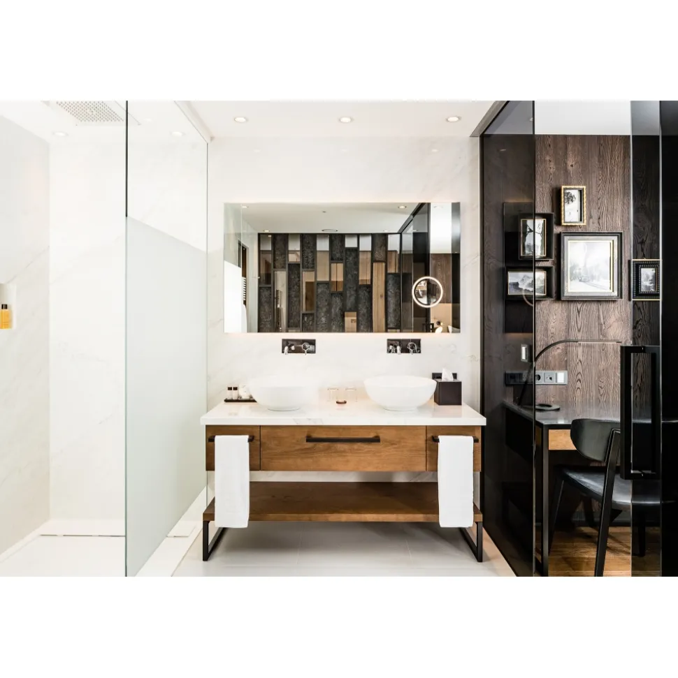55 m² room with double bed, living room separated by a dividing door, in an elegant style combined with shades of brown, wooden floor, terrace or balcony with magnificent view of the Dolomites, desk with minibar, 42” flat screen TV with satellite and SKY (July-September and December-March), telephone, safe, bathroom, WC, whirlpool tub, steam shower, hairdryer, vanity mirror, “Bulgari” cosmetic box.