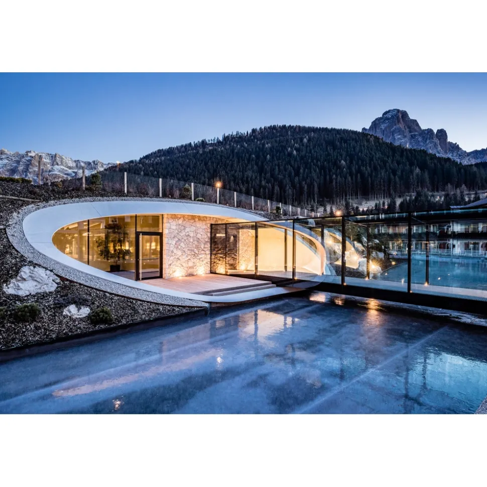 Modern, Grand, Unique – The Wellness Area at the Alpenroyal: An Architectural Masterpiece The newly built wellness area of the Alpenroyal is the polar opposite of the main building. In its modern but simple architecture it is truly unique: flooded with light and with a wonderful view of the Sella Group. The Alpenroyal wellness area is one of the largest in Italy. It includes a large sauna world and a fitness world equipped with the best equipment. The wellness area thus completes the last piece of the Alpenroyal wellness offer, which also includes the Water World, the Grand Parc, various relaxation areas and a Beauty department for treatments and massages.