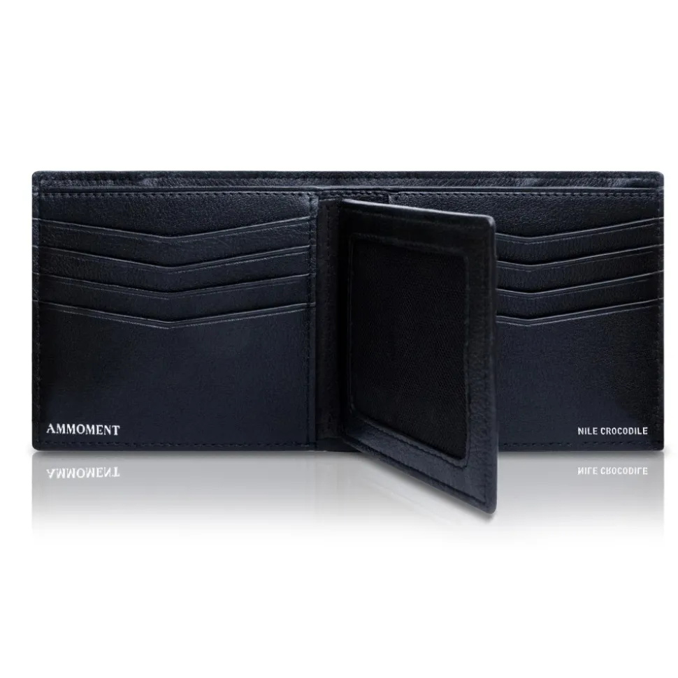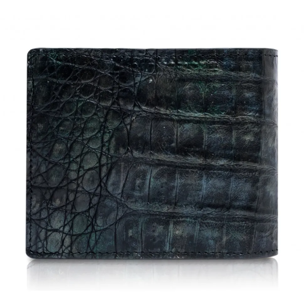 Handmade bifold wallet in caiman leather exterior with cowhide leather lining made in Italy.
