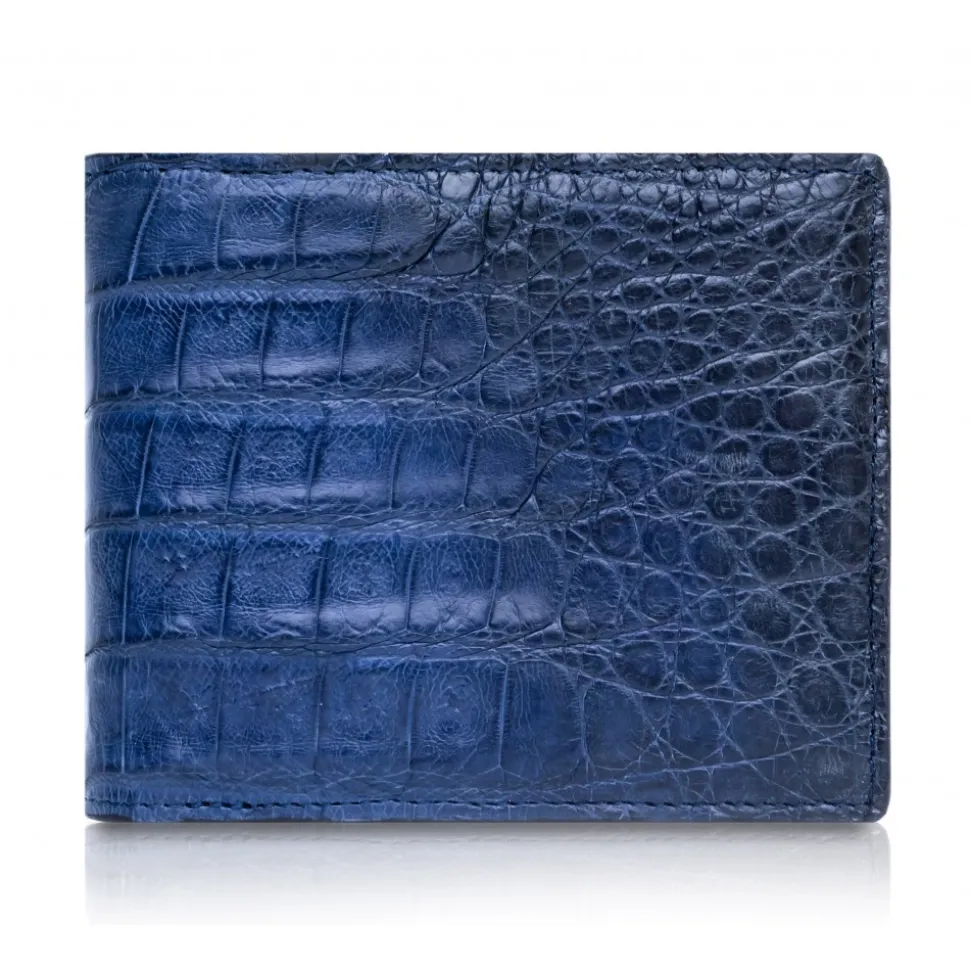 Handmade bifold wallet in caiman leather exterior with cowhide leather lining made in Italy.