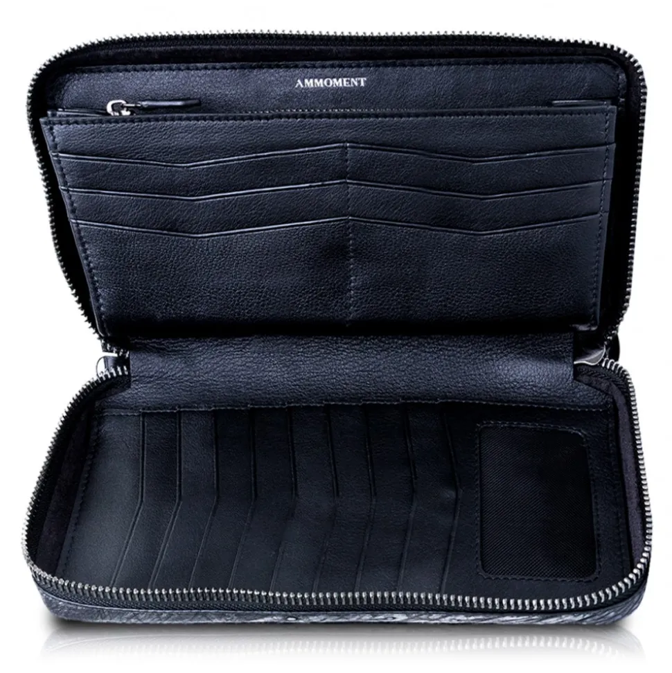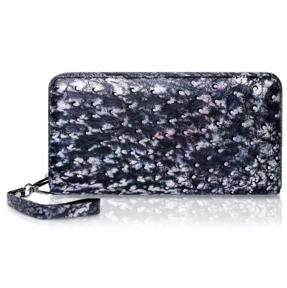 Handmade large long zipper wallet in ostrich and cowhide leather lining made in Italy. The Ostrich skin is hand painted in Tahitian Pearl Black colour, which is a very rare and unique colour.