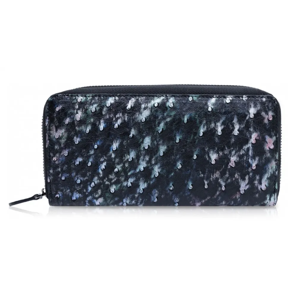 Handmade long zipper wallet in ostrich and cowhide leather lining made in Italy. The Ostrich skin is hand painted in Tahitian Pearl Black colour, which is a very rare and unique colour.