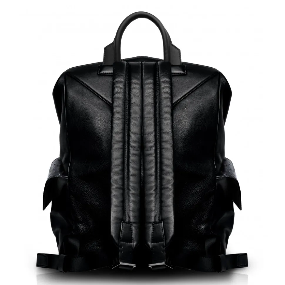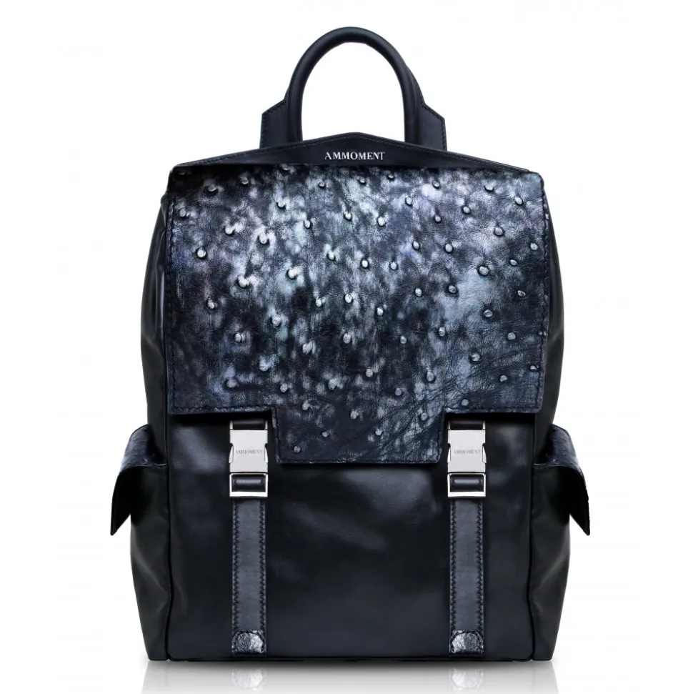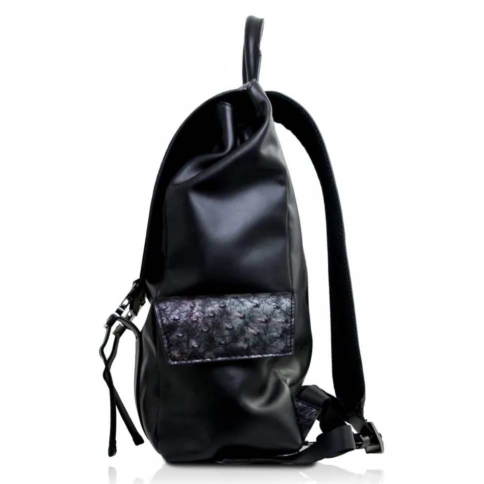 Handmade leather Zane large backpack in ostrich leather and cowhide made in Italy. The ostrich skin is hand painted in Tahitian Pearl Black colour, which is a very rare and unique colour.