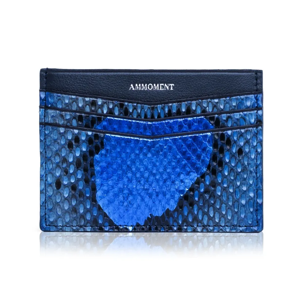 Handmade credit card holder in python leather made in Italy. This credit card holder is hand painted exclusively in Italy in metallic royal blue colour.