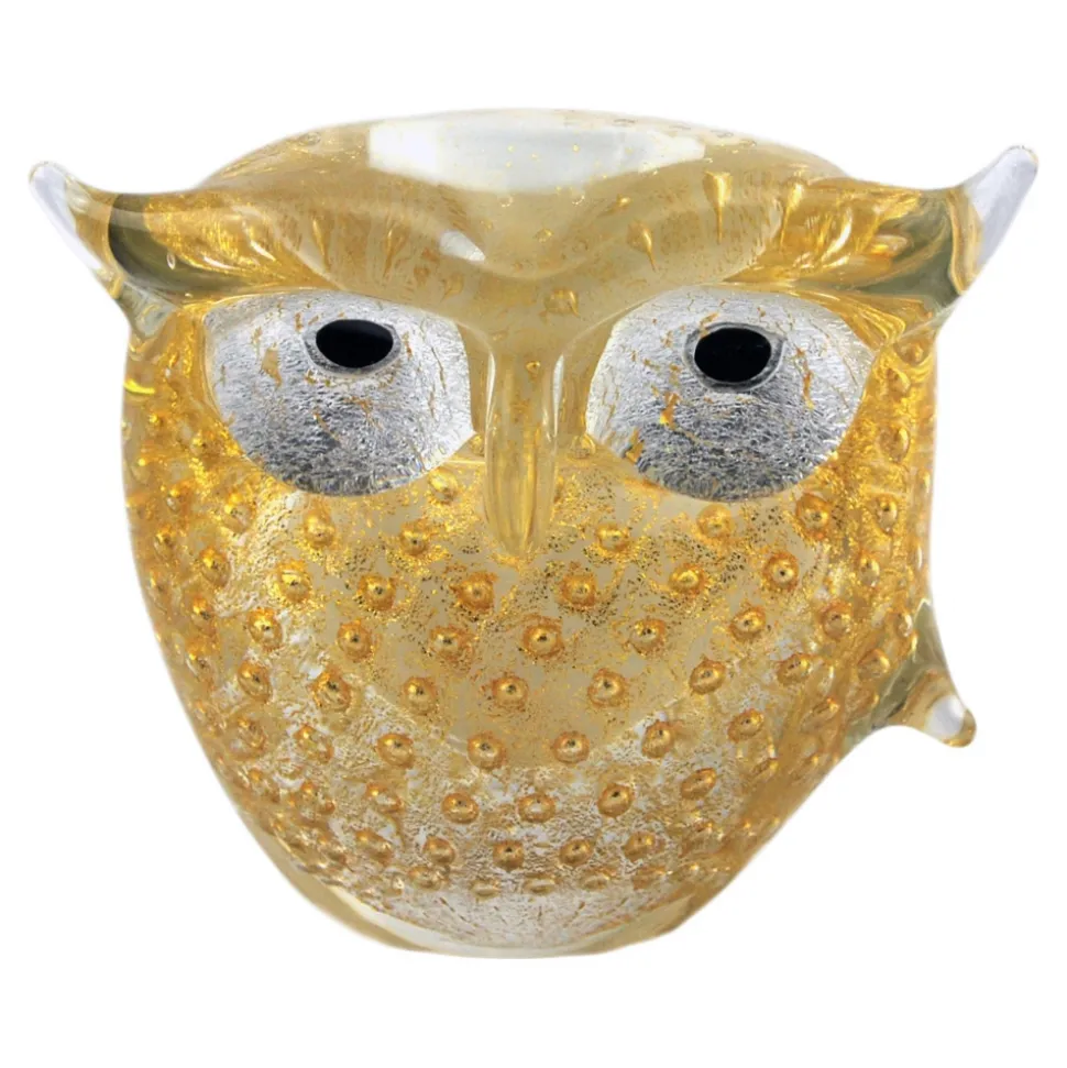 Owl in bollinato technique with 24-kt gold leaf and silver leaf eyes. Completely hand-made Murano glass.
