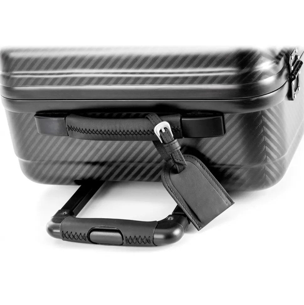 Avvenice Horizon S Trolley in carbon fiber and caved leather. Featuring a surprisingly spacious flat interior compartment, the four-wheeled model represents the future of luxury carry-on luggage. The accessory combines innovation and lightness in every detail, from the new TSA locking system to the most comfortable and silent wheels ever designed.