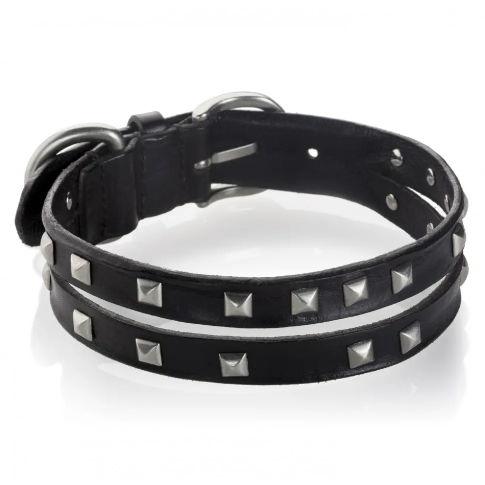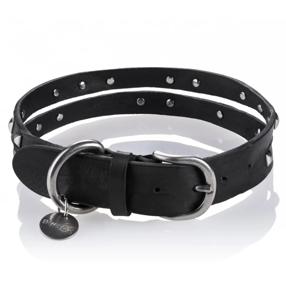 Genuine leather decorated with pyramid shaped studs. B.WILDE name tag. Personalised on request. Silver or antique gold hardware.