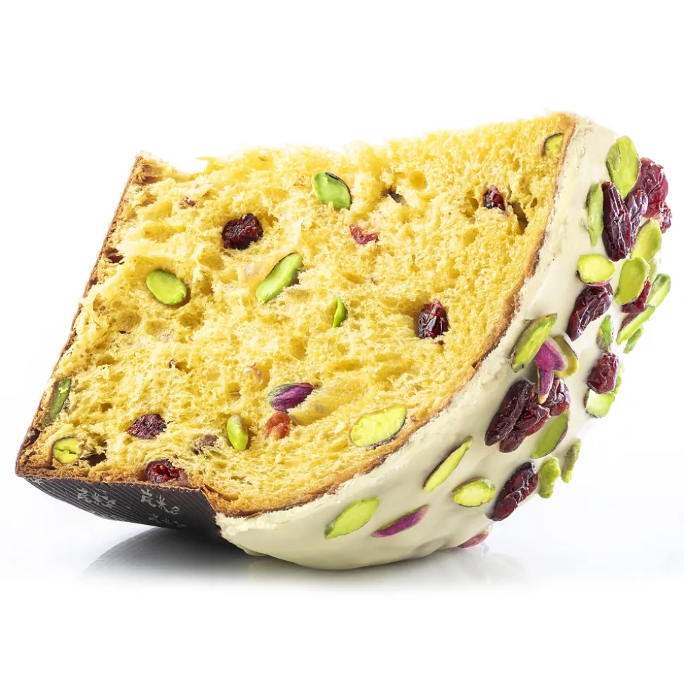 Cranberries and Pistachio the panettone for red fruit lovers! Without raisins and filling cream, with white chocolate covering decorated with cranberries and pistachios, the dough features drops of white chocolate, whole cranberries and pistachios.