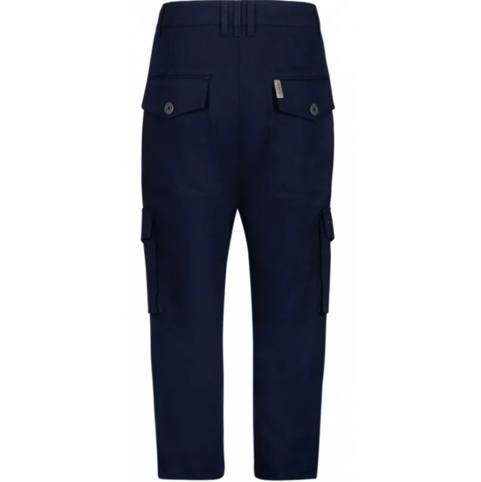 Balmain Navy Blue Cotton Cargo Trousers. navy blue cotton cargo trousers, belt loops, concealed front fastening, two rear button fastening pockets, two side zip fastening pockets, two side button fastening pockets, two front cargo pockets, cropped leg, tonal stitching, silver tone logo plaque.