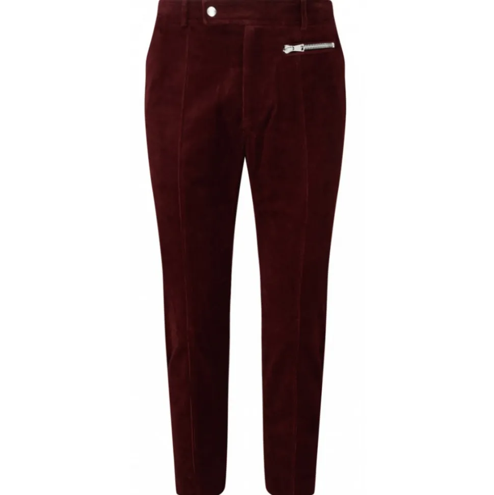 Balmain Bordeaux Red Cotton Suede Cropped Trousers. Bordeaux red cotton suede trousers, belt loops, front button fastening, front zip fastening pocket, two diagonal pockets to the sides, two rear jetted pockets, tapered leg, cropped leg.