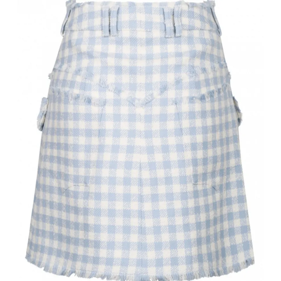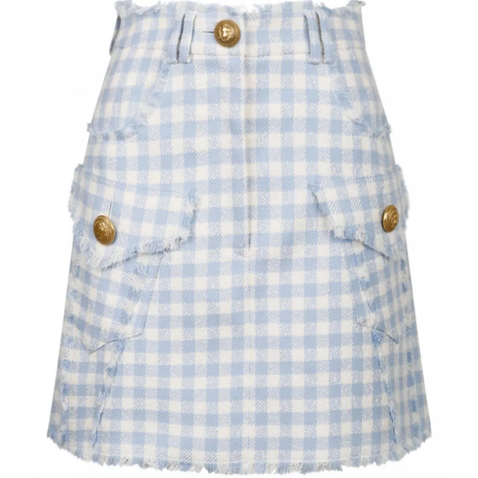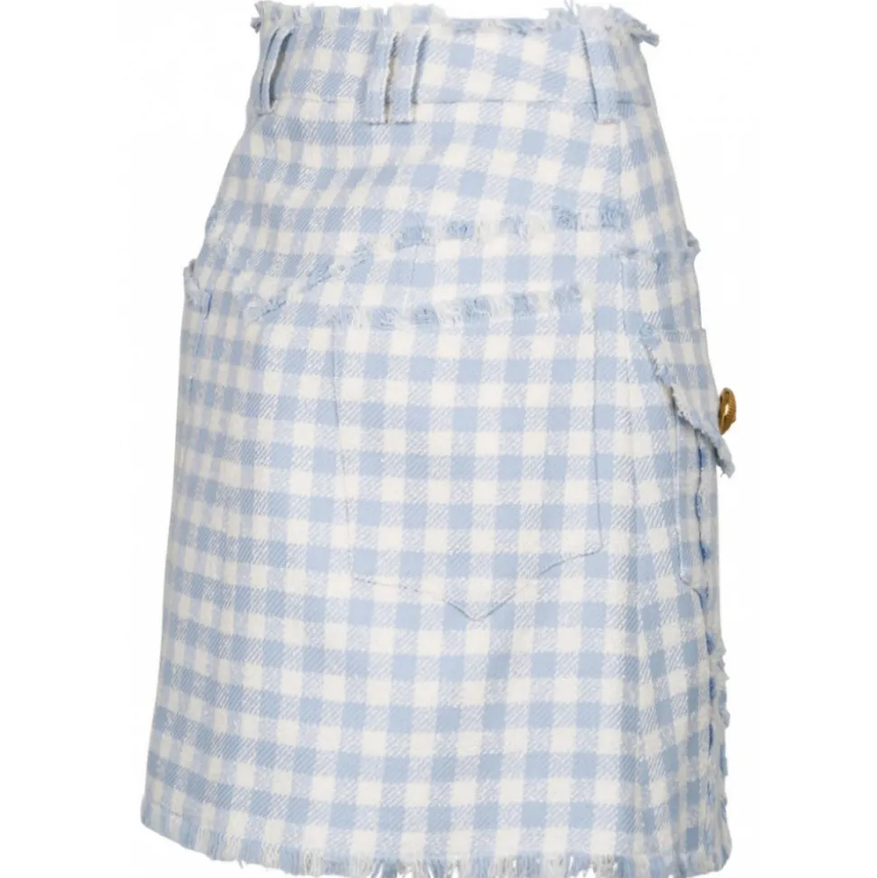 Balmain Blue Gingham Tweed A-Line Skirt. Blue cotton tweed skirt, eight pockets, Western cut out details. Signature Lion golden metal buttons on the front pockets, short and flared cut. Fastening with Signature Lion golden metal button and concealed hook, frayed hem.