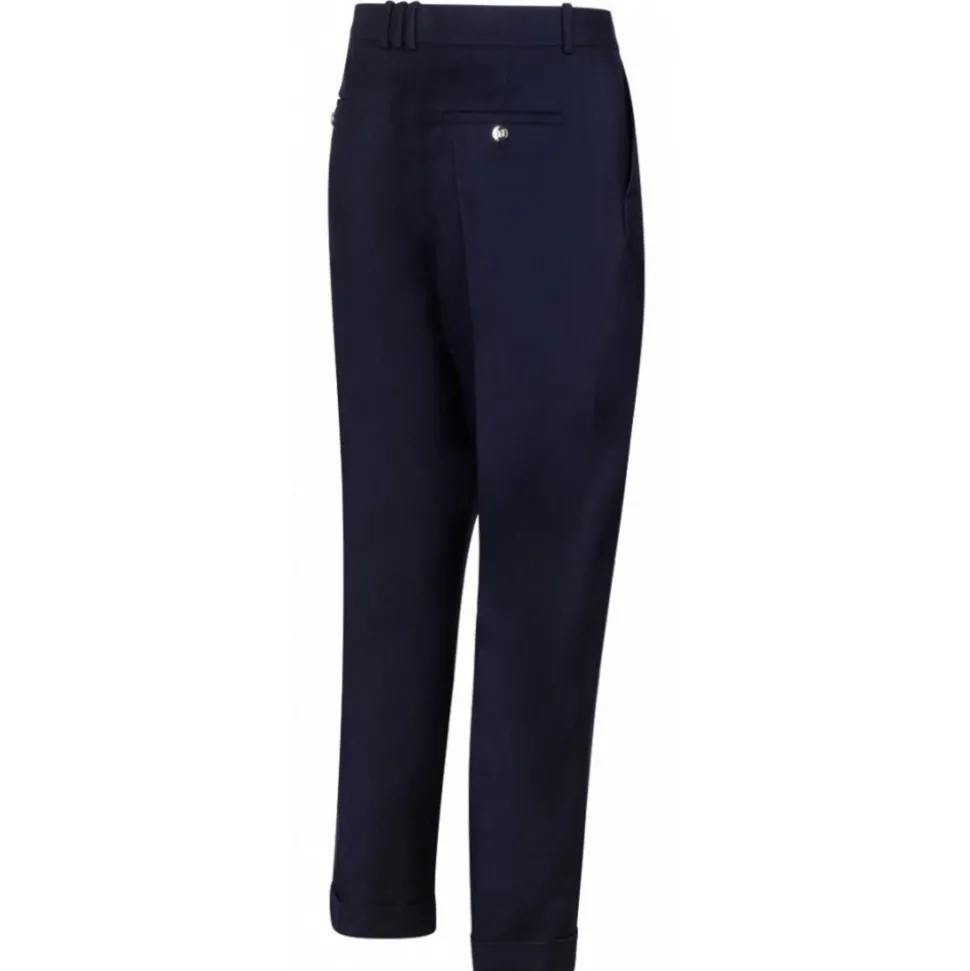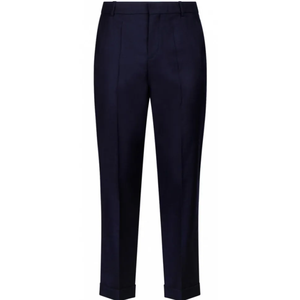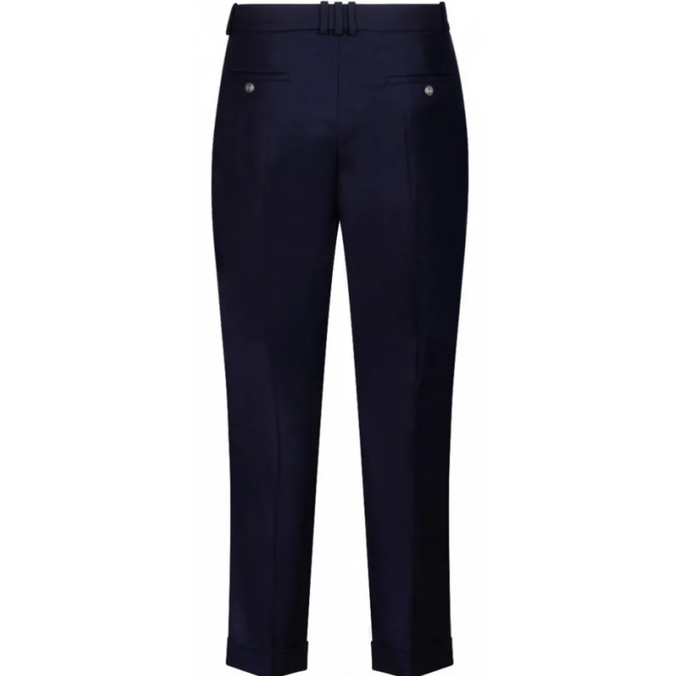 Balmain Marine Jacquard Trousers. Marine blue wool pleated jacquard trousers, tone on tone monogram jacquard, straight cut. Turn ups, fastened with zip and invisible hook at the front, two slanted side pocket.