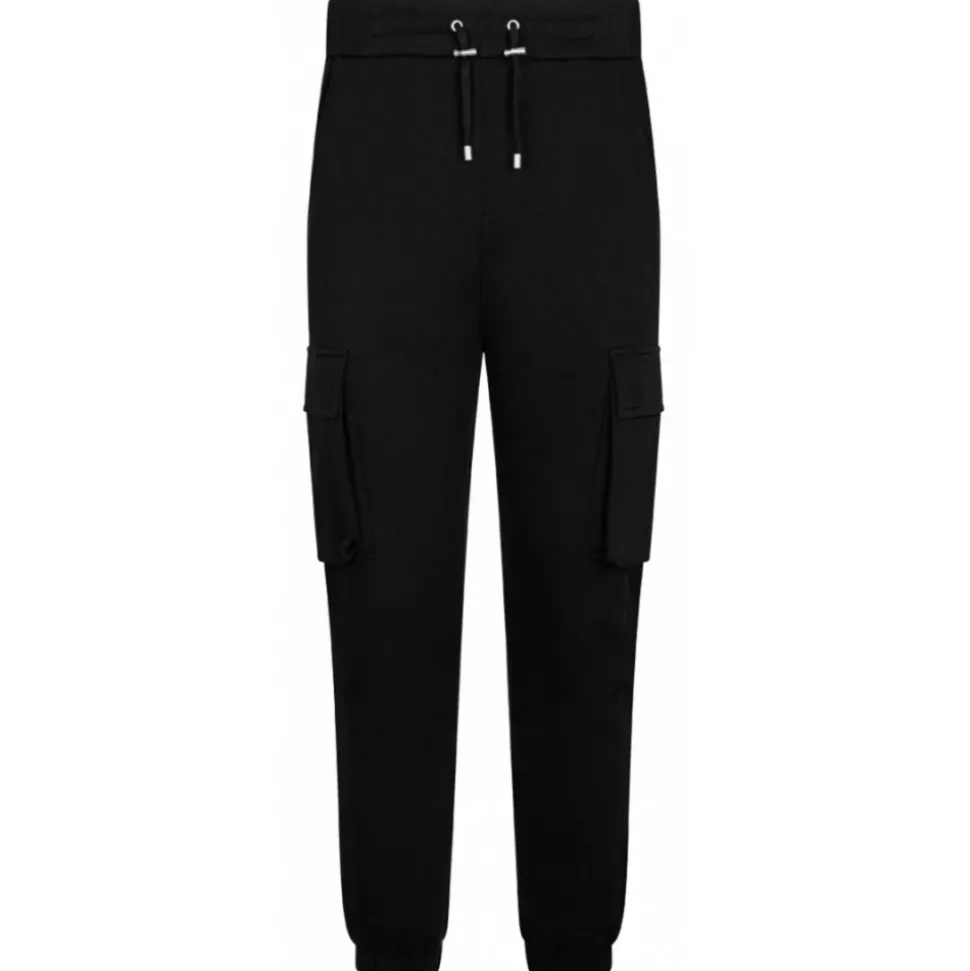 Balmain Black Jogging Bottoms. Black two cargo pockets jogging, contrasting Balmain Paris logo printed at the back, elastic waistband. Drawstring adjustable waist, silver metal eyelets, stoppers and aglets, ribbed trim.