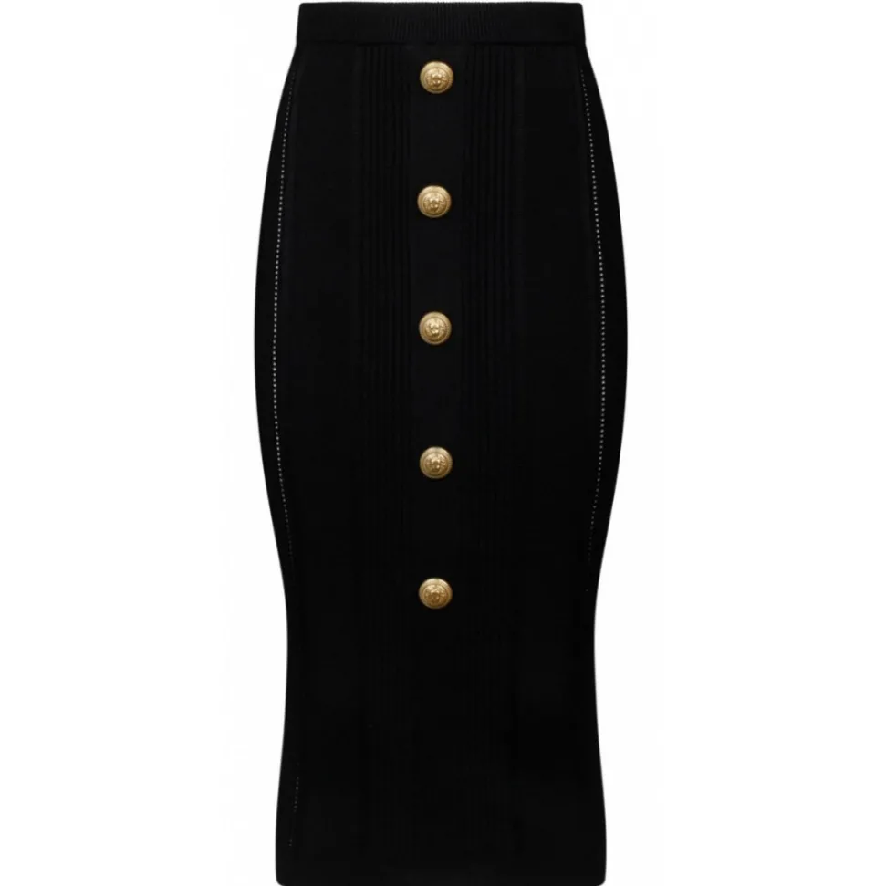 Balmain Black Knit Midi Skirt. Black knit midi skirt, five decorative ” Signature Lion ” golden metal buttons, tight fit, high waist.