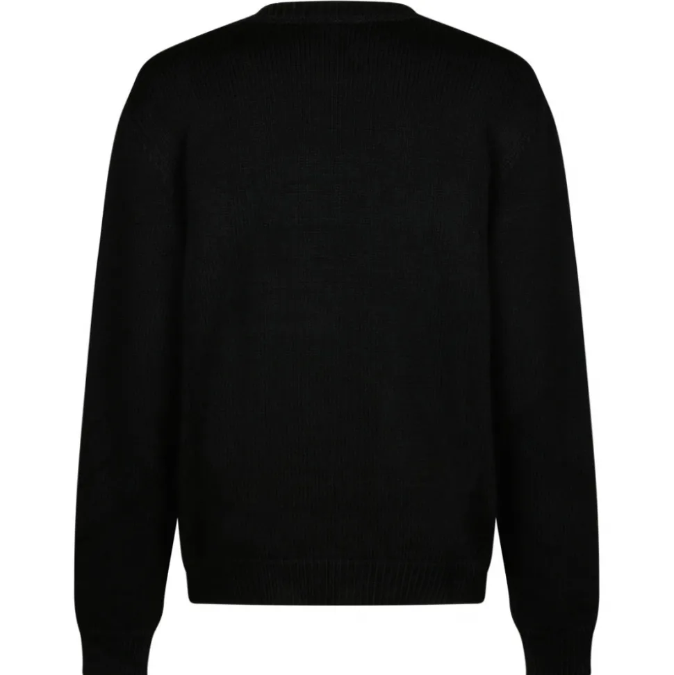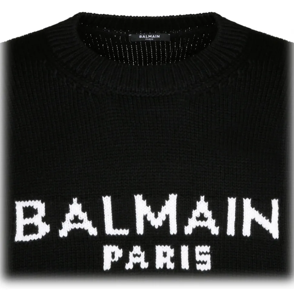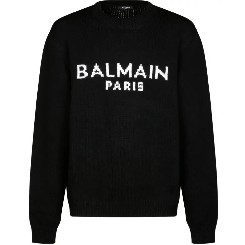 Balmain Black Knitted Construction Jumper. Black wool blend jumper, knitted construction, logo print to the front, crew neck, long sleeves, elasticated cuffs and hem, straight hem.