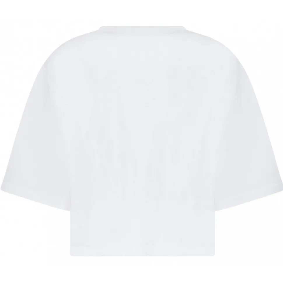Balmain White Logo Print T-Shirt. White cotton t-shirt, cropped, round neck with ribbed trim, short sleeves, contrasting Balmain logo printed on the front.
