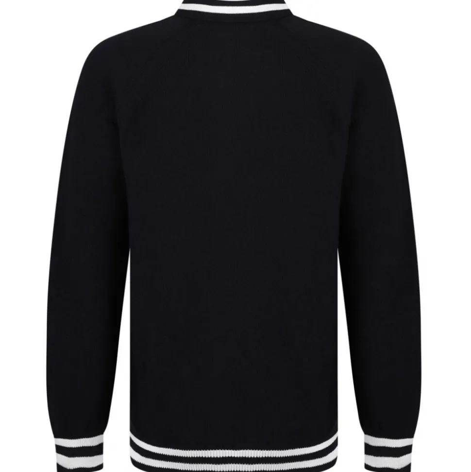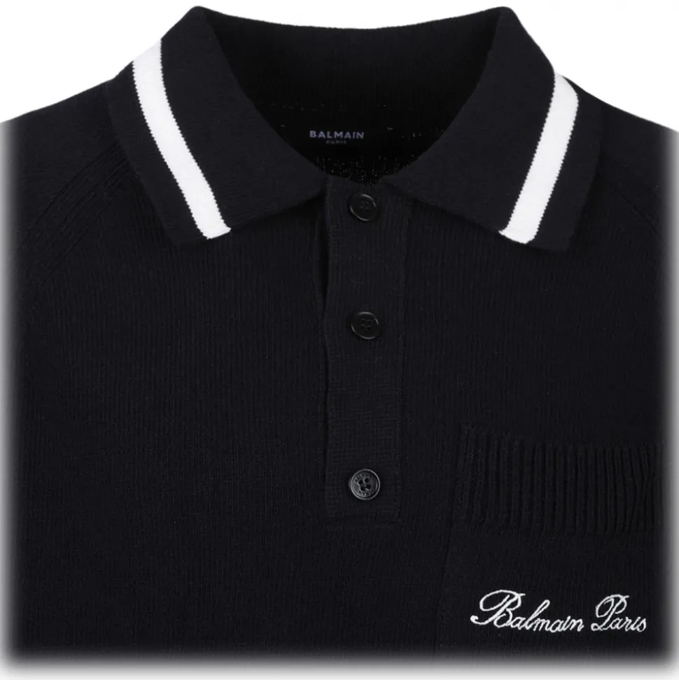 Balmain Black Polo Shirt. Black cotton polo shirt, embroidered logo at the chest, striped border, logo engraved buttons. Polo collar, front button placket, chest patch pocket, long sleeves, ribbed cuffs and hem.