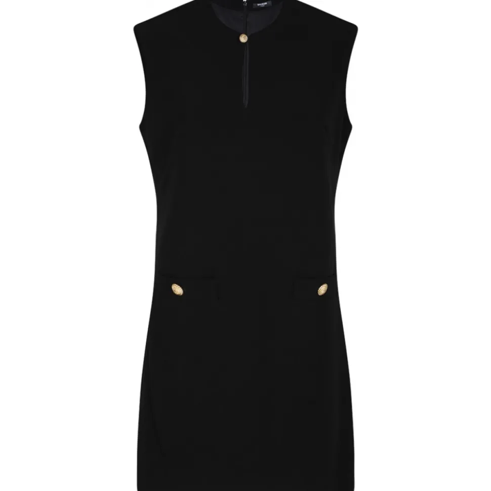 Balmain Black Mini Dress. Black crepe texture mini dress, shift style, concealed rear hook and zip fastening, keyhole neck. Sleeveless, two front welt pockets, decorative button detailing, full lining and straight hem.