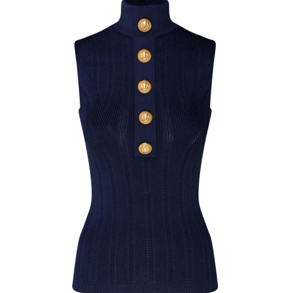 Balmain Navy Blue Pointelle Knit High Neck Top. Navy blue pointelle knit top, high neck, embossed gold tone buttons, sleeveless and straight hem.