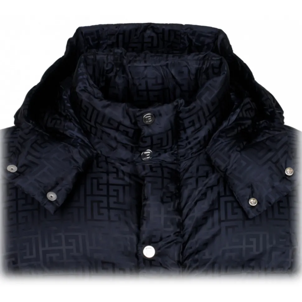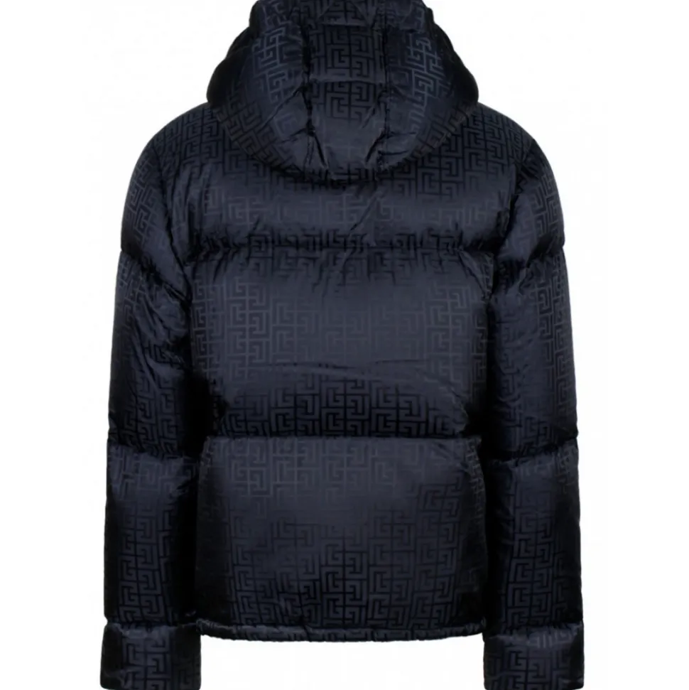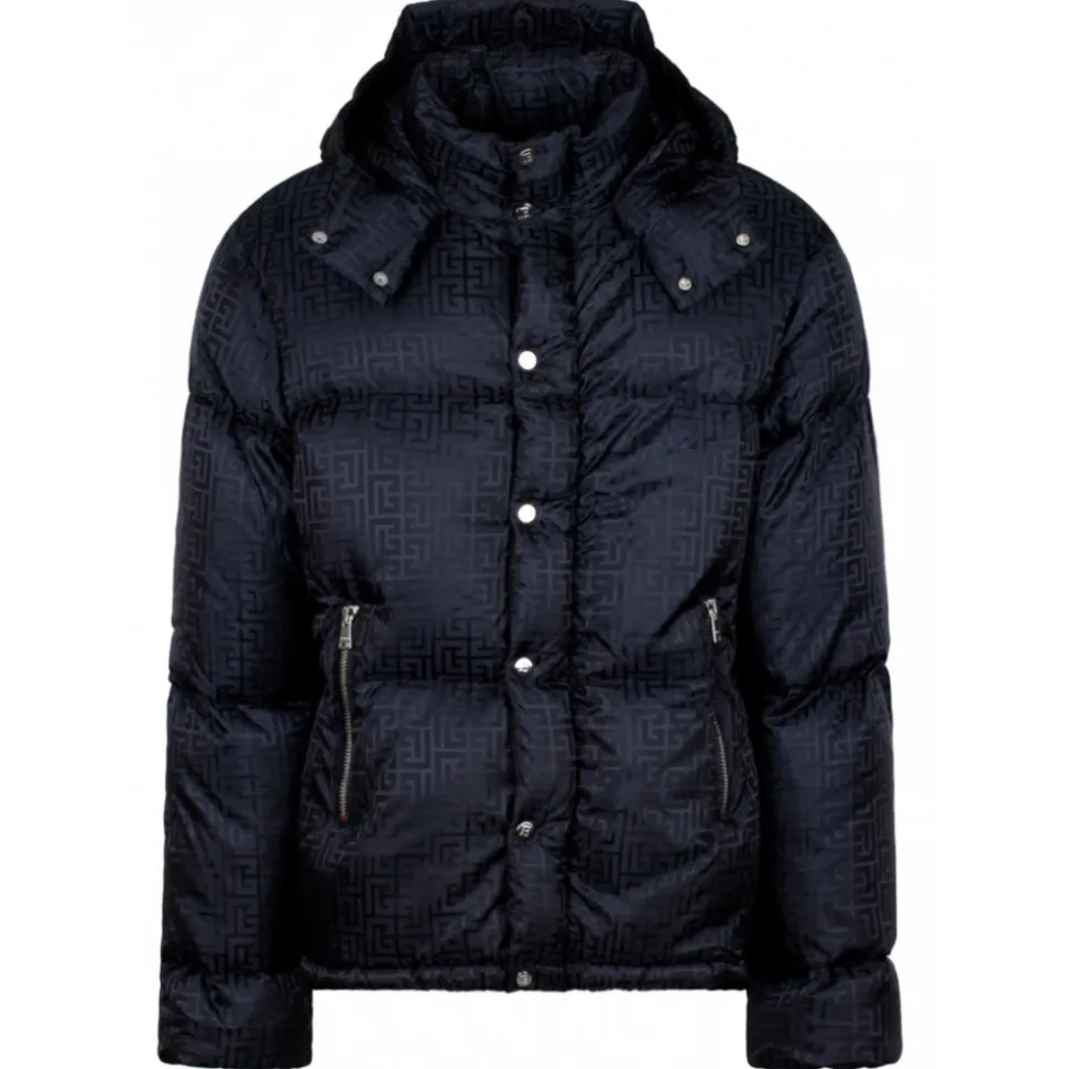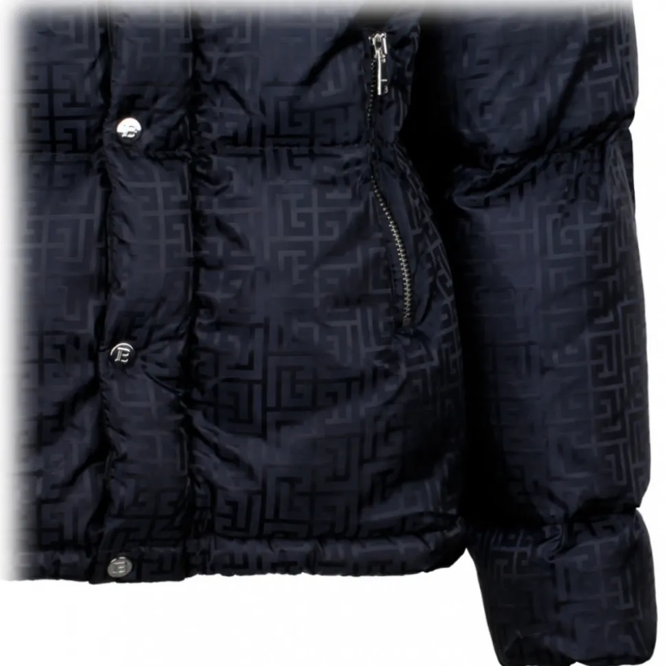 Balmain Navy Blue Puffer Jacket. Navy blue padded design jacket, signature PB monogram print, detachable hood, high neck. Front zip fastening, long sleeves, ribbed cuffs, two side zip fastening pockets, straight hem.