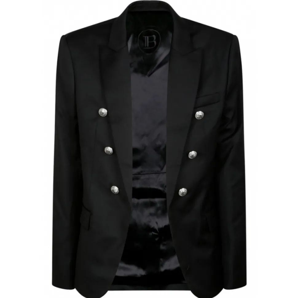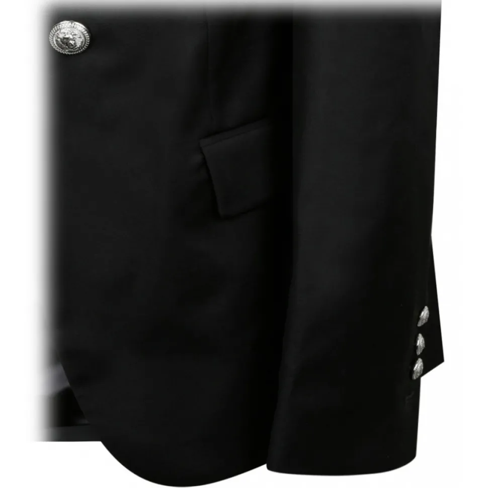 Balmain Black Tailored Blazer. Black wool blazer, peak lapels, faille. Long sleeves, buttoned cuffs, chest welt pocket, two front flap pockets, full lining. Two internal slip pockets, central rear vent, embossed silver tone buttons, decorative double button detail.
