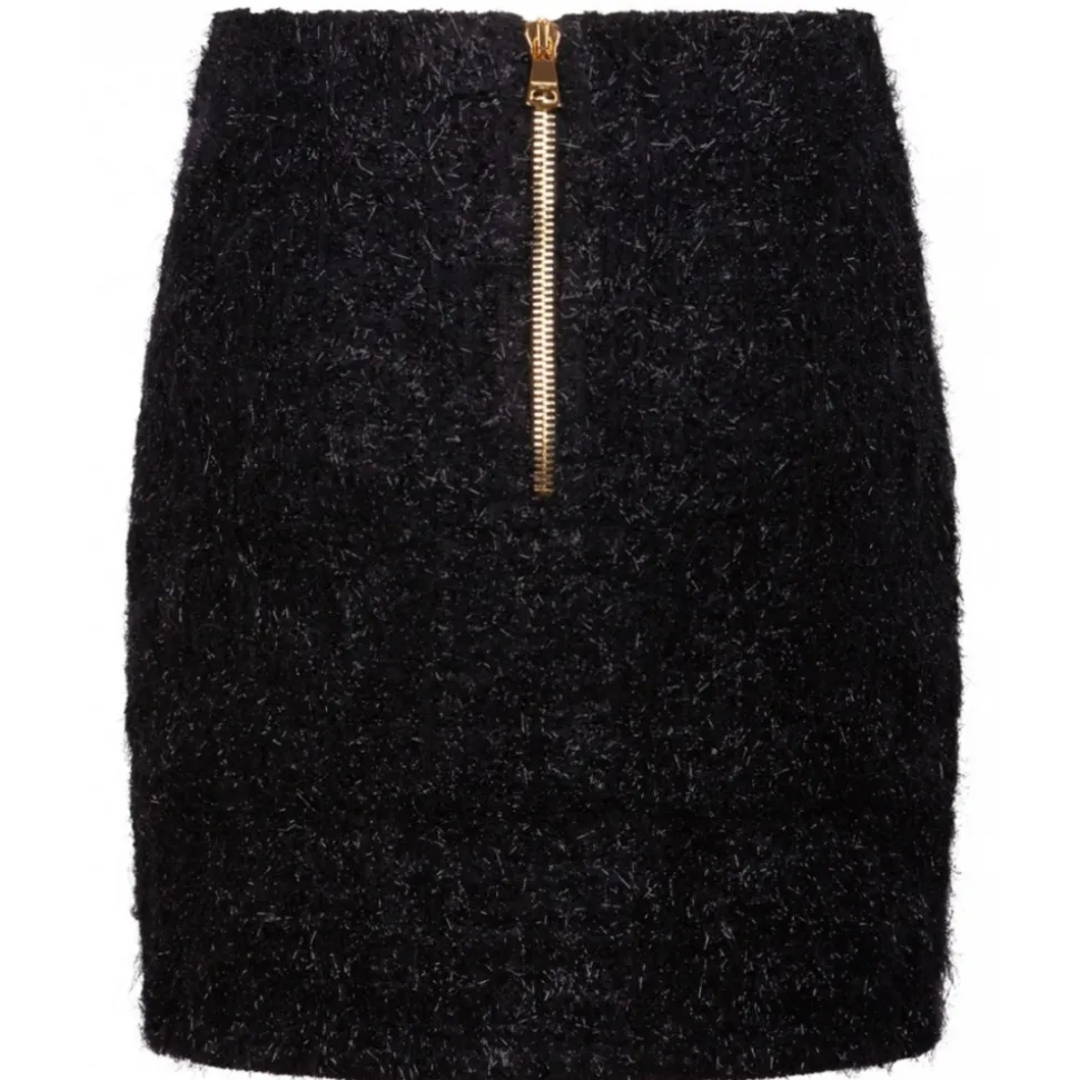 Balmain Black Tweed Mini Skirt. Black tweed mini skirt, gold metal details, two decorative buttons applied on the front. Zip fastening on the back and straight hem.