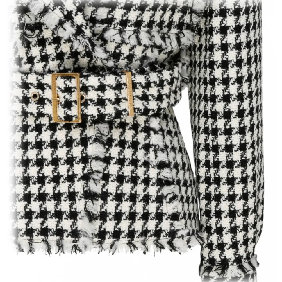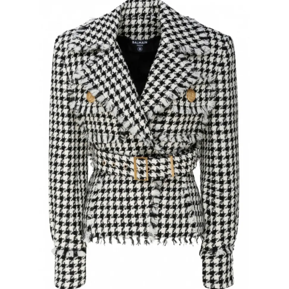 Balmain White and Black Virgin Wool Tweed Belted Jacket. White and black virgin wool jacket, houndstooth pattern, embossed gold tone buttons, frayed edge, belted waist, shoulder pads, long sleeves, chest flap pockets.