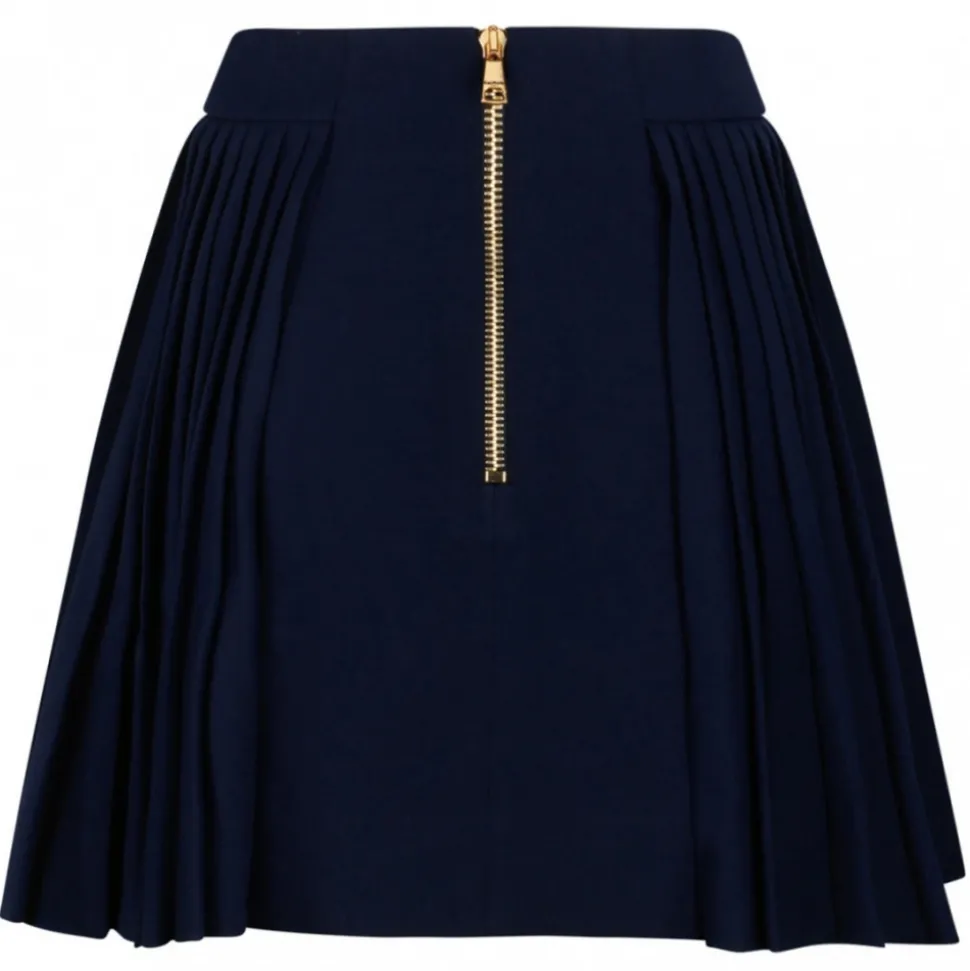 Balmain Navy Blue Wool Pleated Miniskirt. Navy blue wool miniskirt, decorative button detailing, pleat detailing, fitted waistline, rear zip fastening, straight hem.