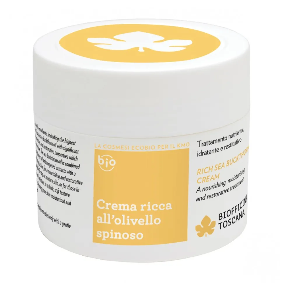 A cream packed with emollients, including the highest quality organic Tuscan sea buckthorn oil with significant antioxidant, protective and restorative properties which gives it its orange hue. The sea buckthorn oil is combined with organic sunflower oil and targeted extracts with a soothing and toning action for a nourishing and restorative treatment. Suitable for dry or mature skin, or for those in search of profound moisture in a thick, soft texture. It sinks in quickly, leaving your skin moisturised and delicately scented.