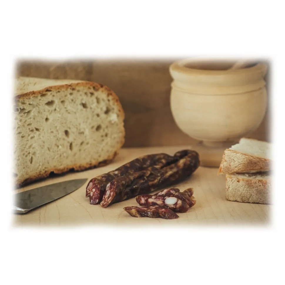 The carefully selected meat, seasoned with a mixture of salt and pepper, rests for 4 days in brine in order to absorb all that spices. Afterwards our butcher masters proceed to the veiling and to the ligature of the Sausages that allows it to mature for 6 months.