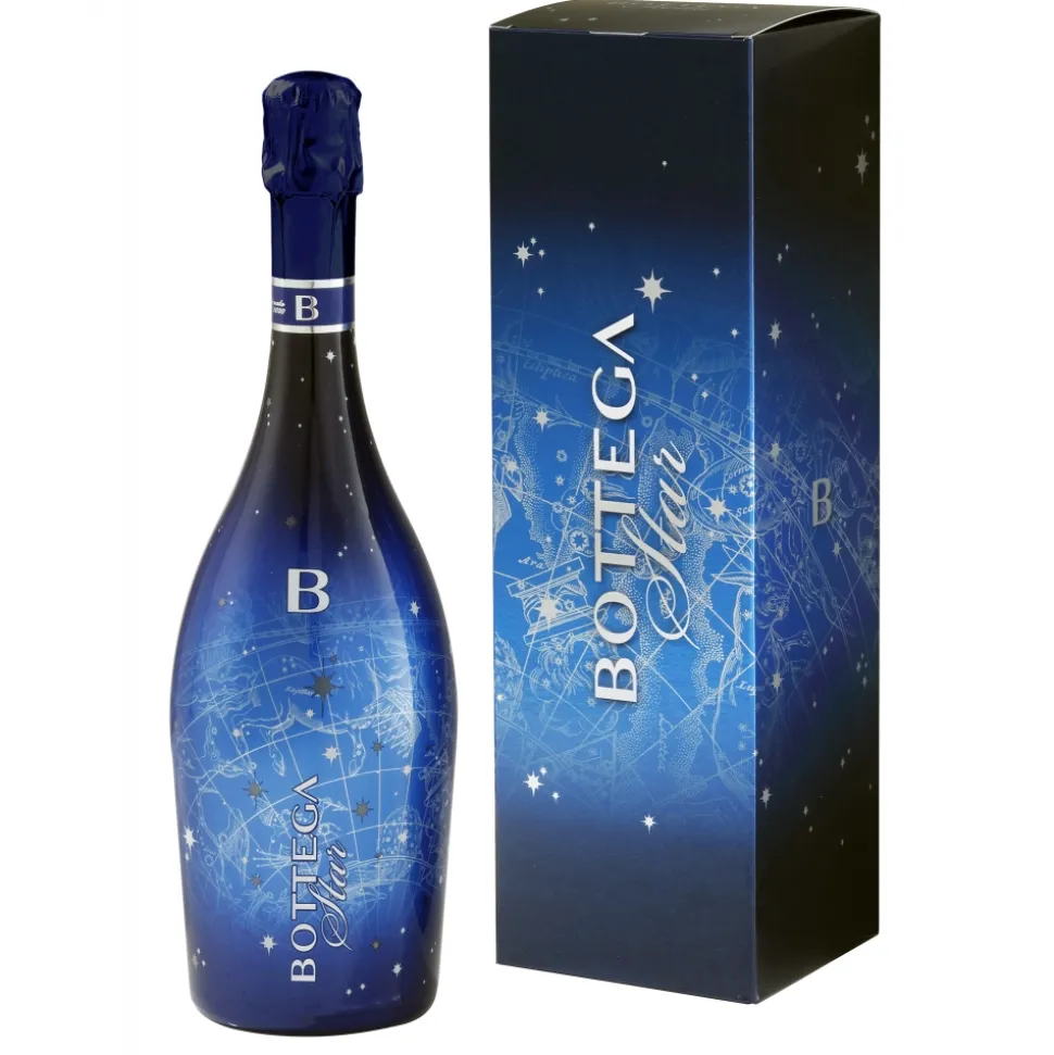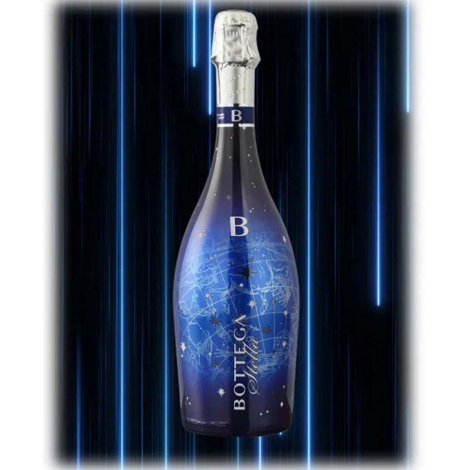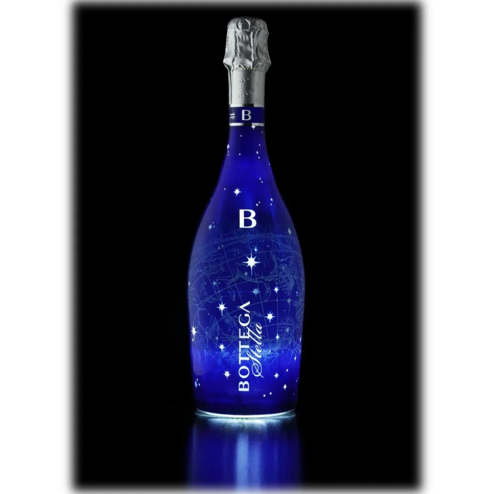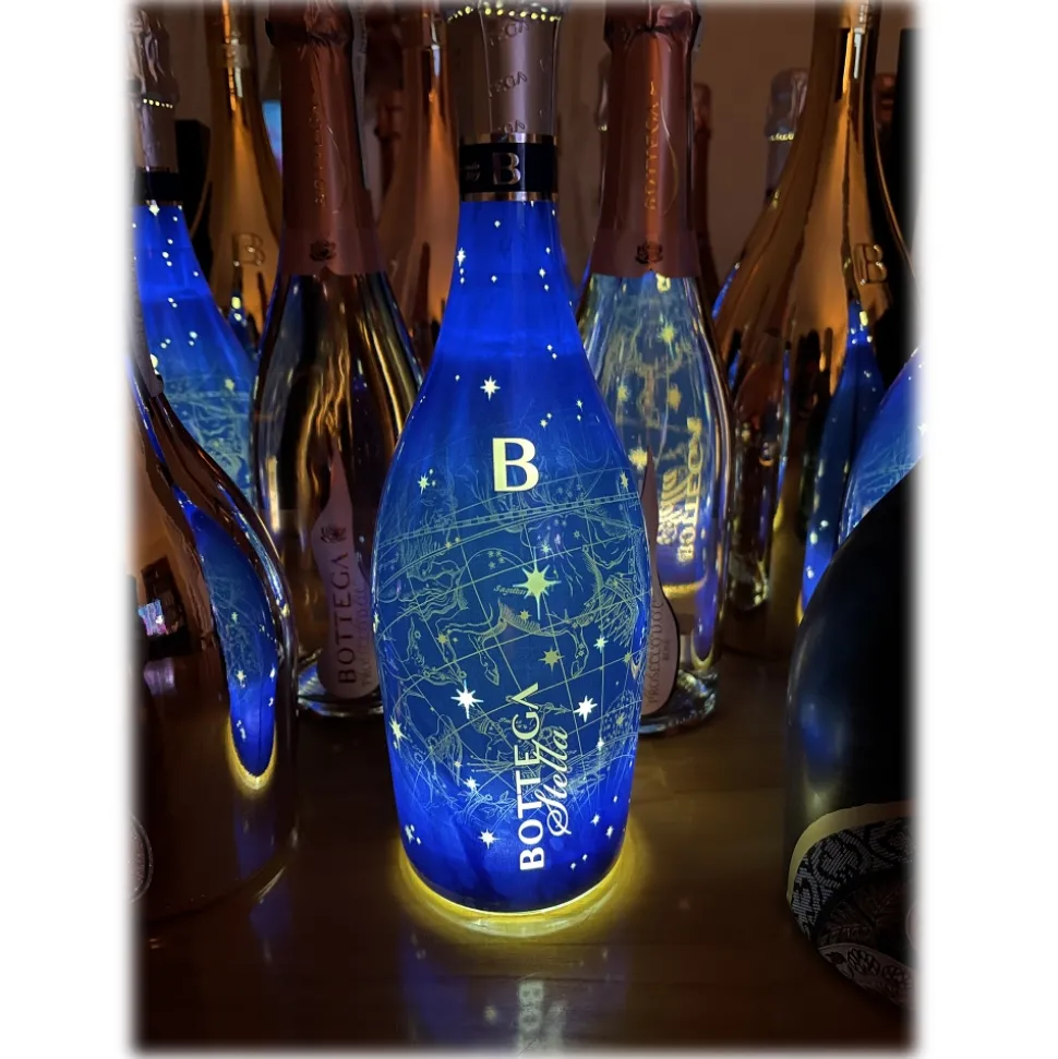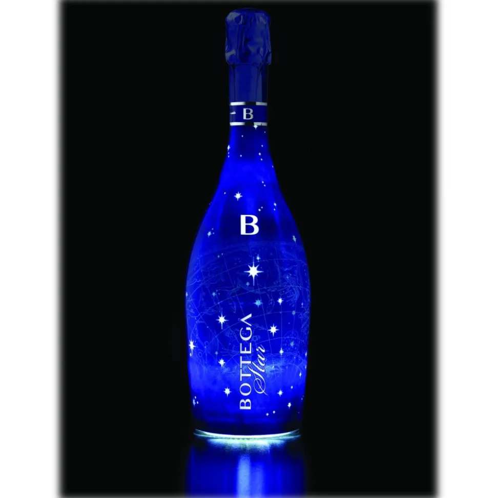 Bottega Stella is a Brut sparkling wine with great personality that originates from a special cuveé obtained from Pinot Noir, Chardonnay and Glera grapes. The bottle of great and immediate impact reproduces a constellation on its surface. The blue background highlights the stars that shine intensely, thanks to the LED bulb placed at the base of the bottle itself and operated by a simple switch. Original and refined, Bottega Stella is an intriguing suggestion for exclusive parties, informal events, evenings with friends.