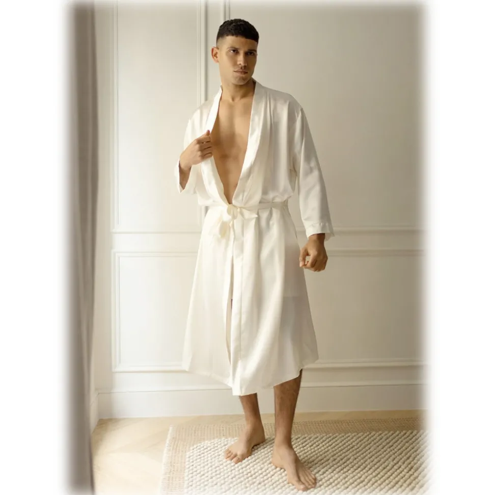 Long Silk Robe (One Size M-XL) Unisex Mulberry Silk Robe is the star of your morning and evening self-care rituals. I designed one universal large size to be unbelievably luxurious and comfortable. It has an additional tie inside to assure that the robe stays closed with your every move. Wear it with nothing underneath, and experience the incredible feeling of second skin or on top of your silk pajamas for the elegant total look.