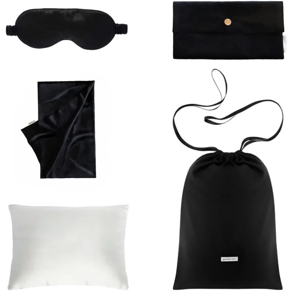 Each travel set comes with an elegant and practical black travel bag and a matching black pouch for the eye mask. That way you always have a practical, well-protected and luxurious set for travel. The ultimate luxury travel companion.