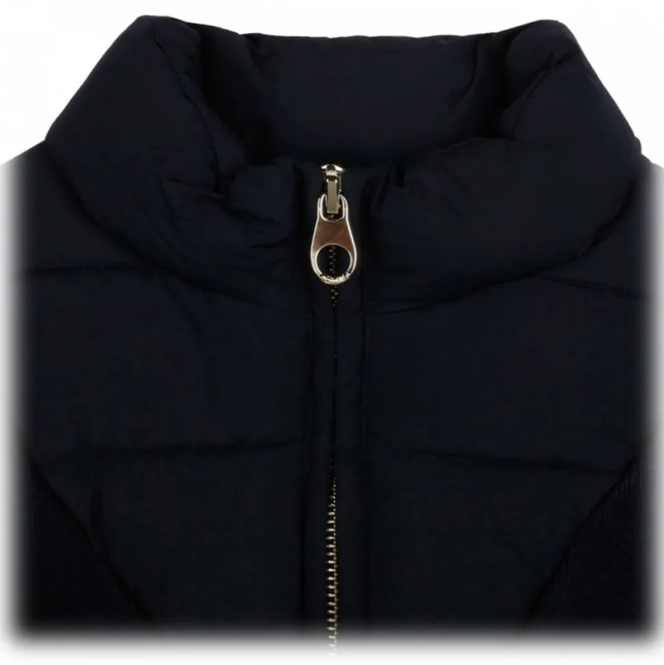 Chloé Kids Navy Blue Logo Plaque Cape. Navy blue cotton cape, quilted panles, silver tone logo plaque, high neck, half front zip fastening.