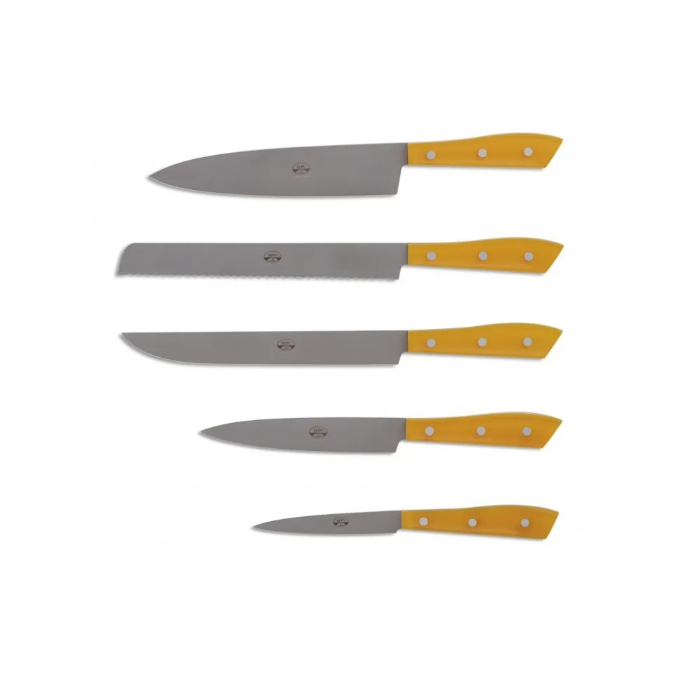 Exclusive Berti 1895 Knives set. 5 knife blocks, plexiglass, laser cut blade. Whole tang, amber.