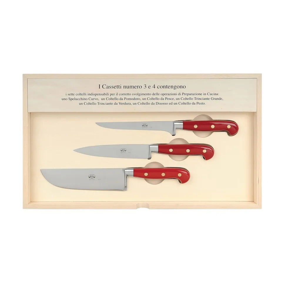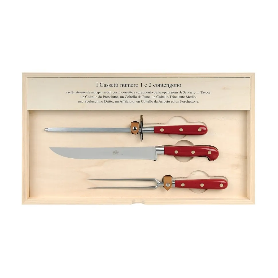 Exclusive Berti 1895 Cutlery Set. Preparation and service set, plexiglass, forged blade. Whole tang, red.