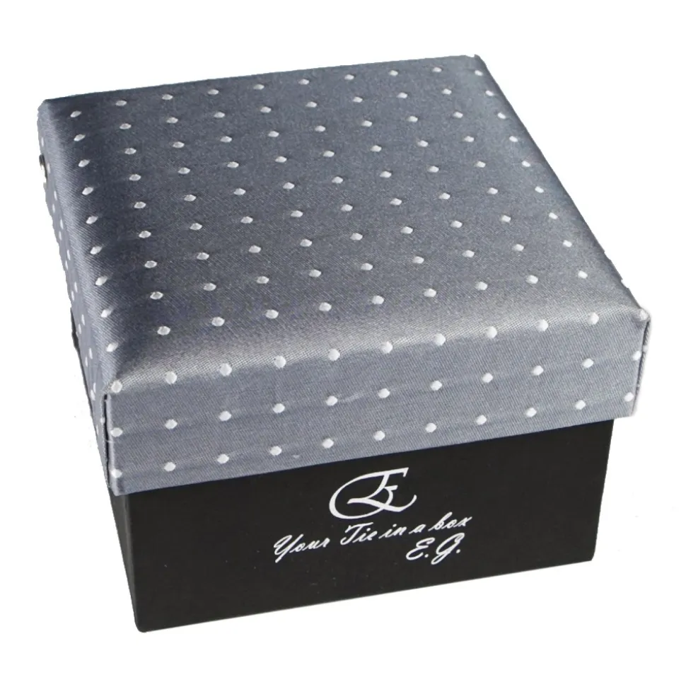This tie proposes a unique and elegant style with a simple and original bicolor motif. In its luxury box you can find two cuff-links and a pocket square, all of the same motif of the tie. Not forgetting the polished steel clip for the final touch. Based on an original idea, the motif and tie box are labeled under the brand E.G. that is represented on the box with an elegant signature discreetly located on the side of the box.