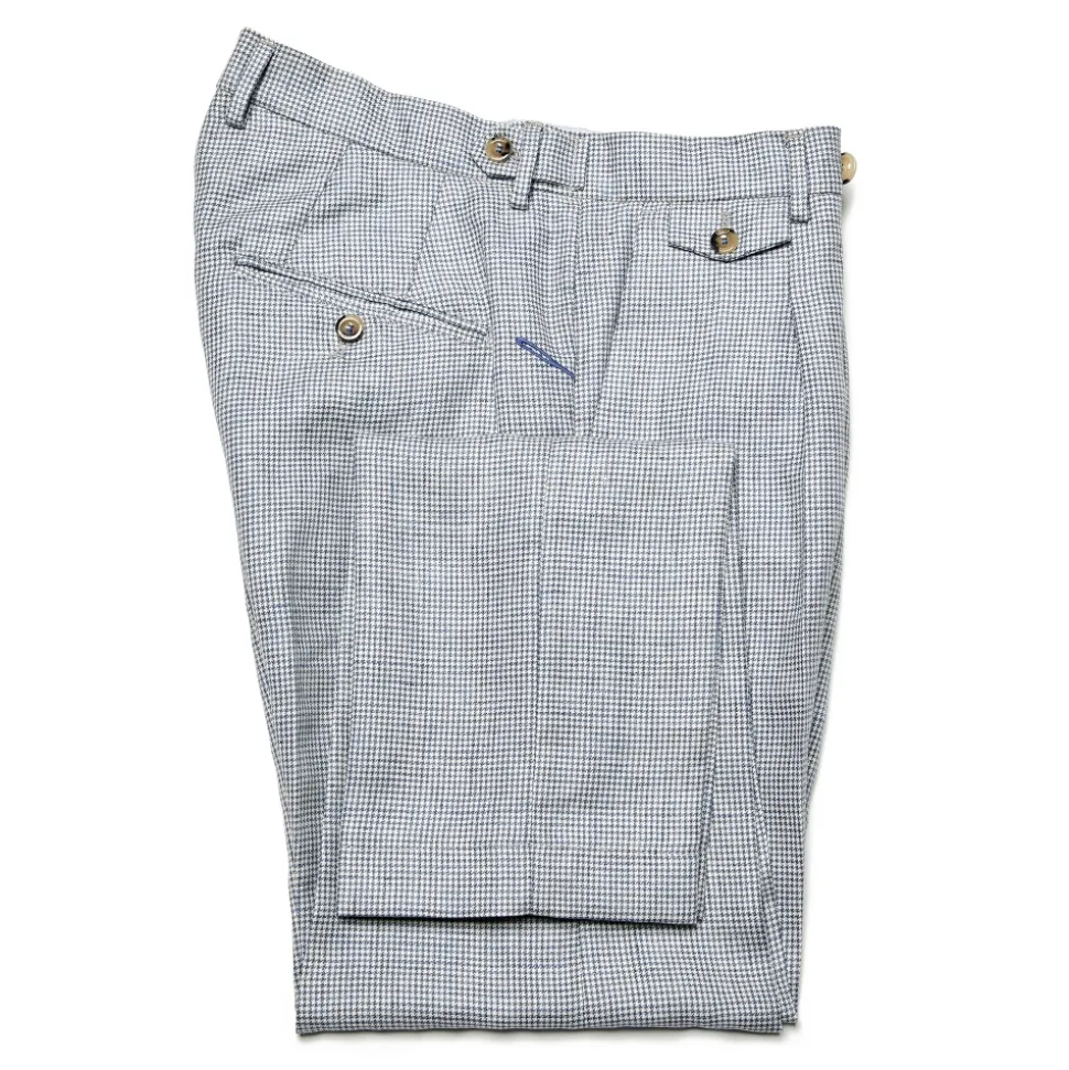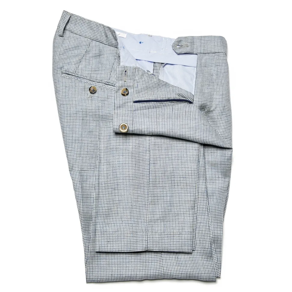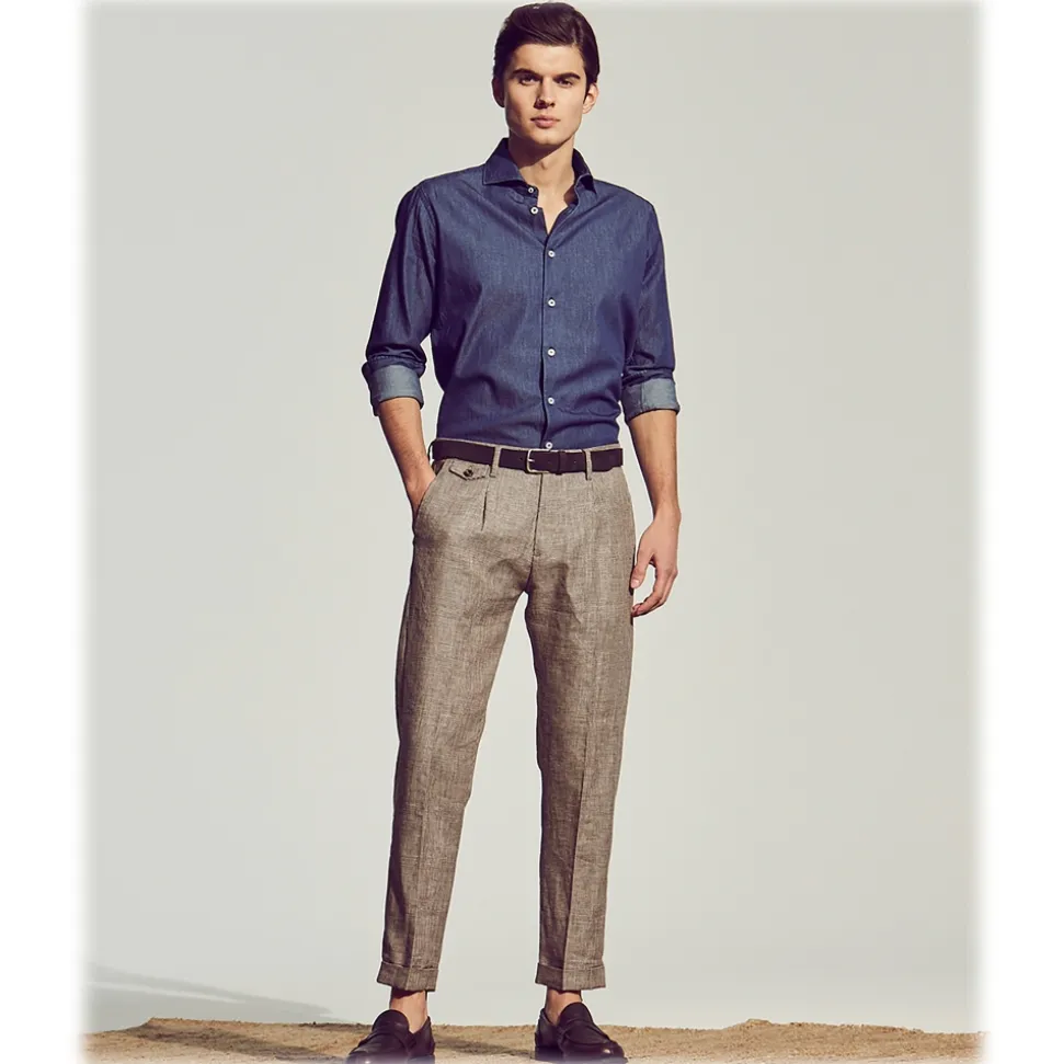 Linen and wool is one of the most elegant and bespoke blends, thanks to its fresh and soft handfeel and its unmistakable silky light, for a stylish and refined look. The Smooth fit with the 18cm trouser-legs bottom and its soft lines perfectly suits the most recent trends and is enriched with a sartorial taste and strengthened by refined details, like the pinces, the side adjusters and the closure with tab.
