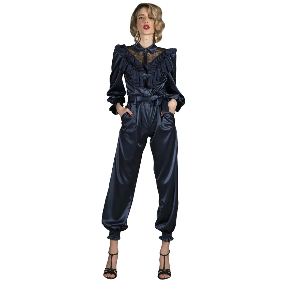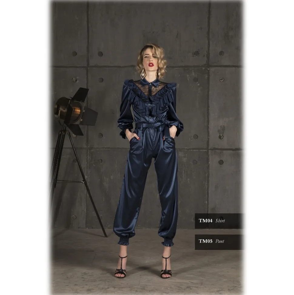Danilo Forestieri – Silk Shirt with Ruffles and Contrasting – Blue Midnight – Shirt – Haute Couture Made in Italy – Luxury Exclusive Collection