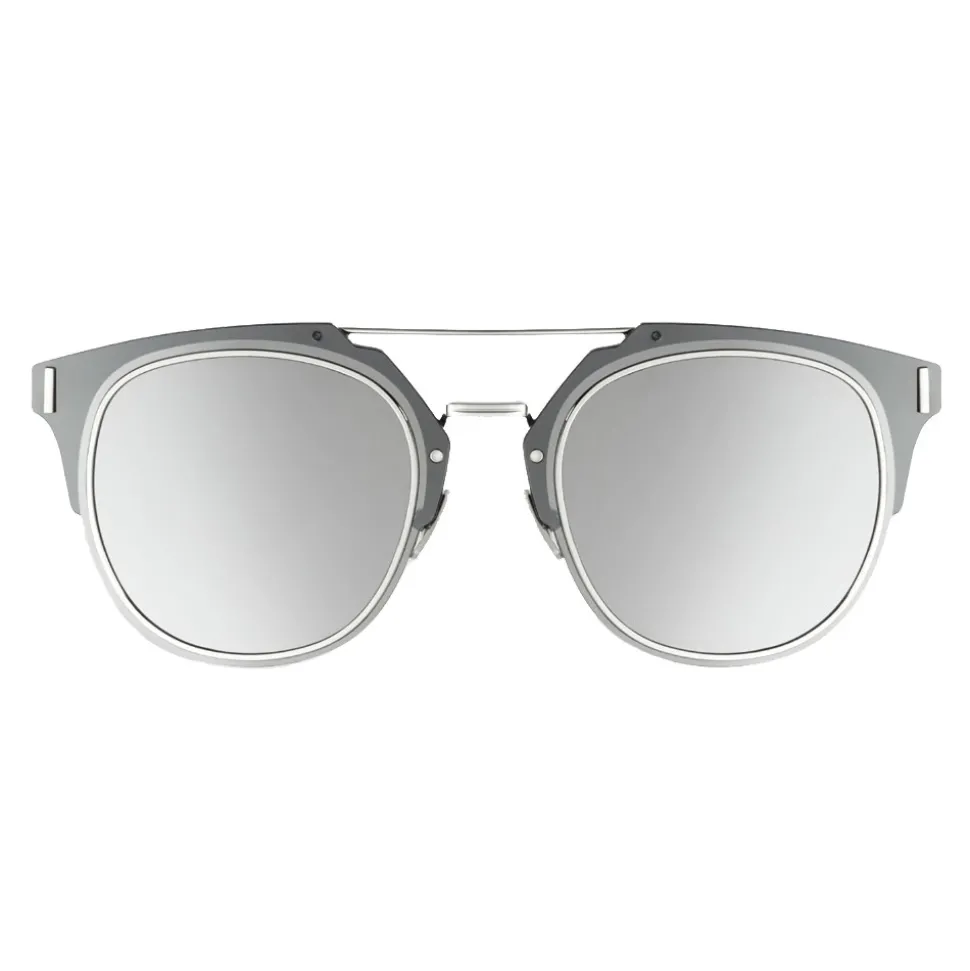 “Dior Composit 1.0” sunglasses presented during the Summer 2015 fashion show. They feature a pantos shape with silver mirror flat lenses and a tone-on-tone ultrathin silver metal frame. The pierced staff reveals the emblematic scar Dior Homme.