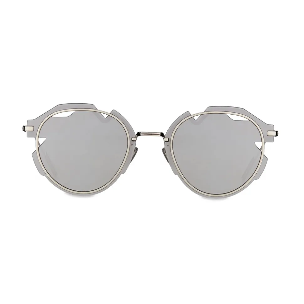 The DiorBreaker sunglasses from the Summer 20 fashion show have a fragmented silhouette, inspired by the Dior Future Relics Collection created in collaboration with Daniel Arsham. Simulating a product that has eroded over time, the cracked and openwork accents lend unexpected detailing to the pantos shape. Ultra-flat silver mirrored lenses sit within the gold metal frame, utilizing sophisticated construction techniques.